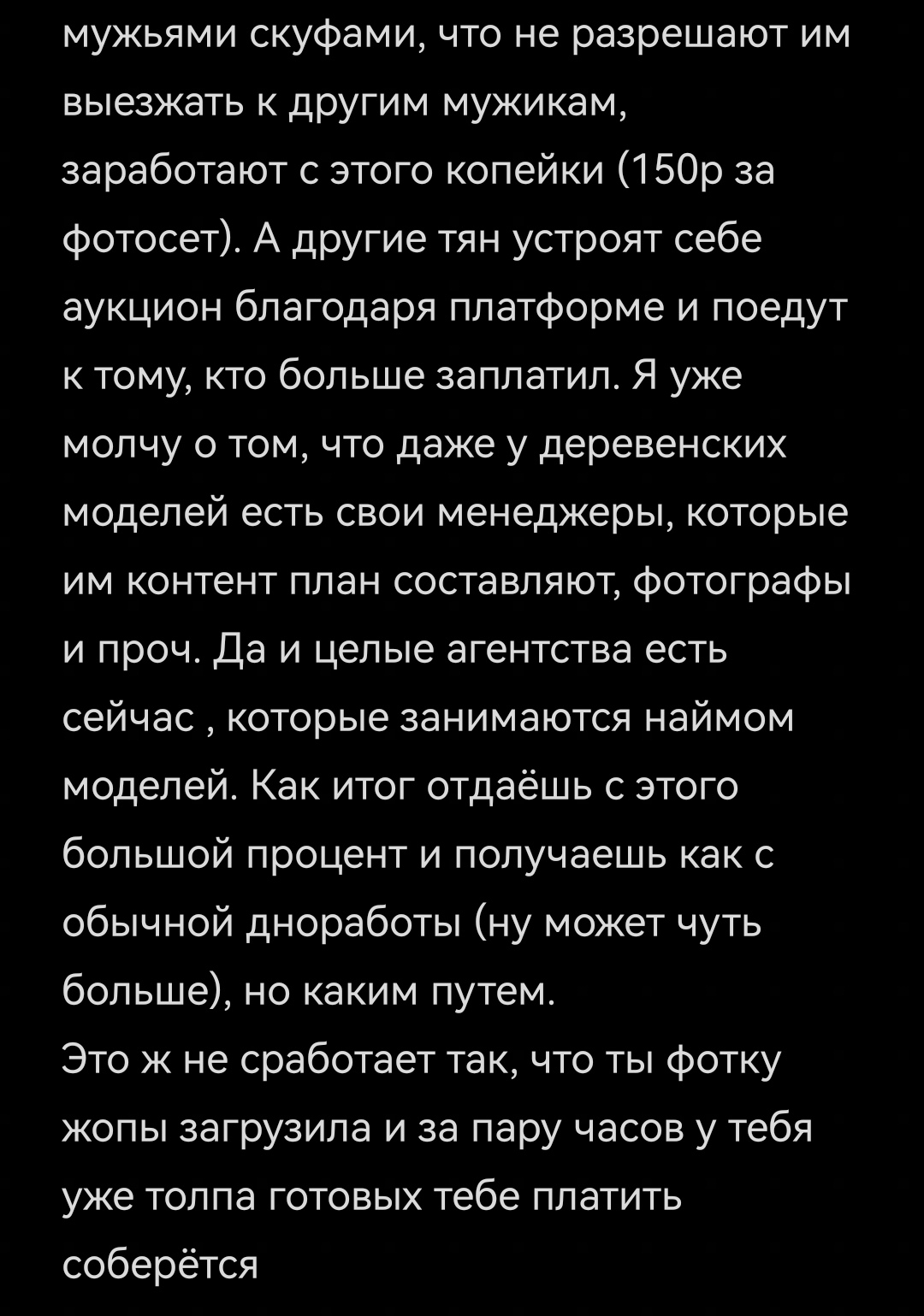 А по поводу выезда к клиентам это проблематично. Даже в другой город в своей же стране выезжать сложно. У них есть индивидуальные заказы же. Девки рассказывали о всякой крипоте типа фоток в ванной под водой (типа труп лежит) или просто лежат в одной позе на полу неподвижно на видео. Всякие извраты находят нужный типаж и просят их повторить фетиши. За счет этого еще зарабатывают многие.