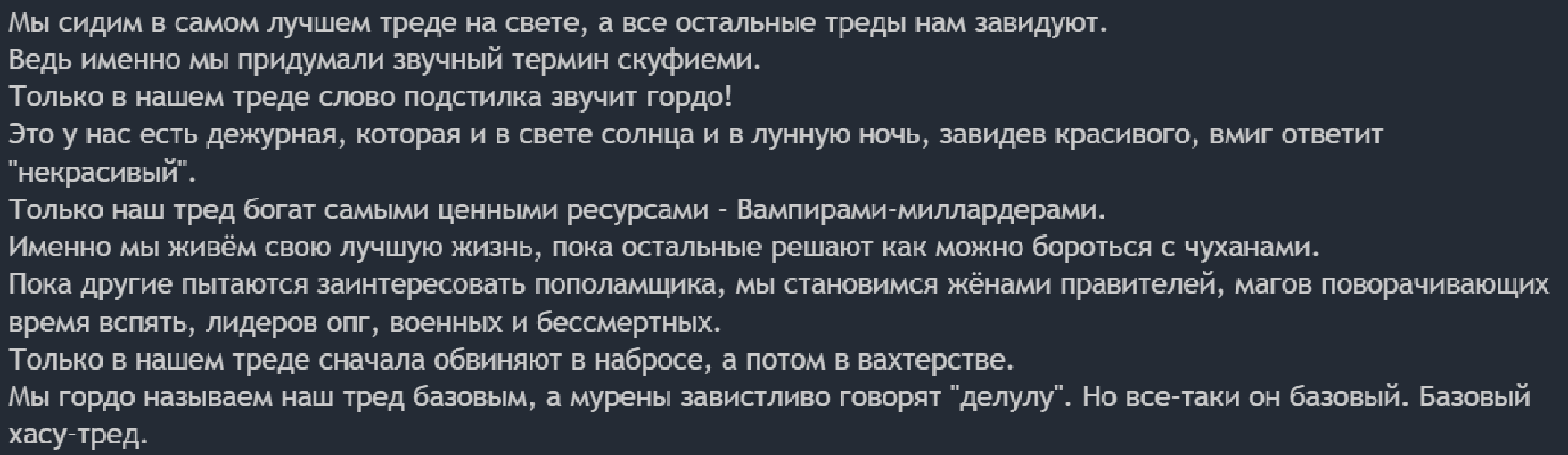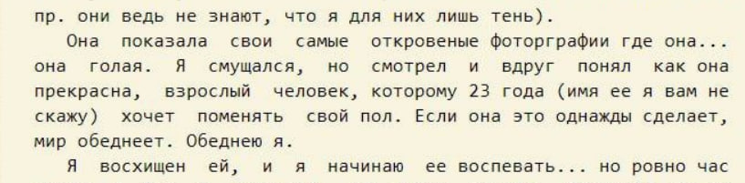 Алсо, я не очень верю, что это писал кун. У нас в бц был всего один кун, с которым я говорила голосом и это был биологический кун. В основном в бц сидели одни тян, потому что интересно копаться в этих сплетнях.