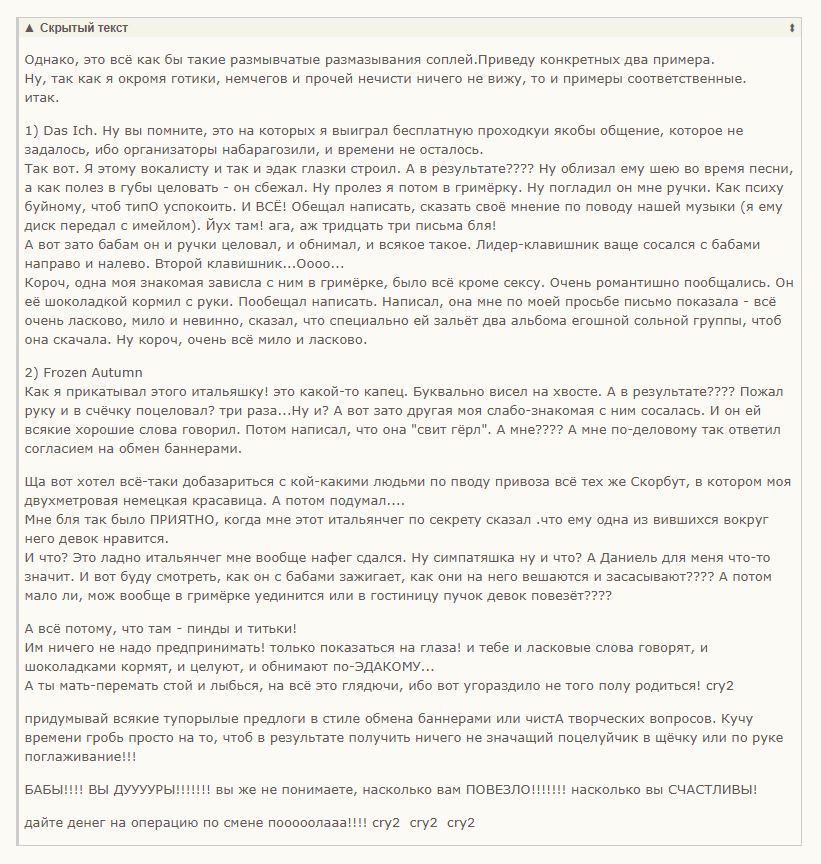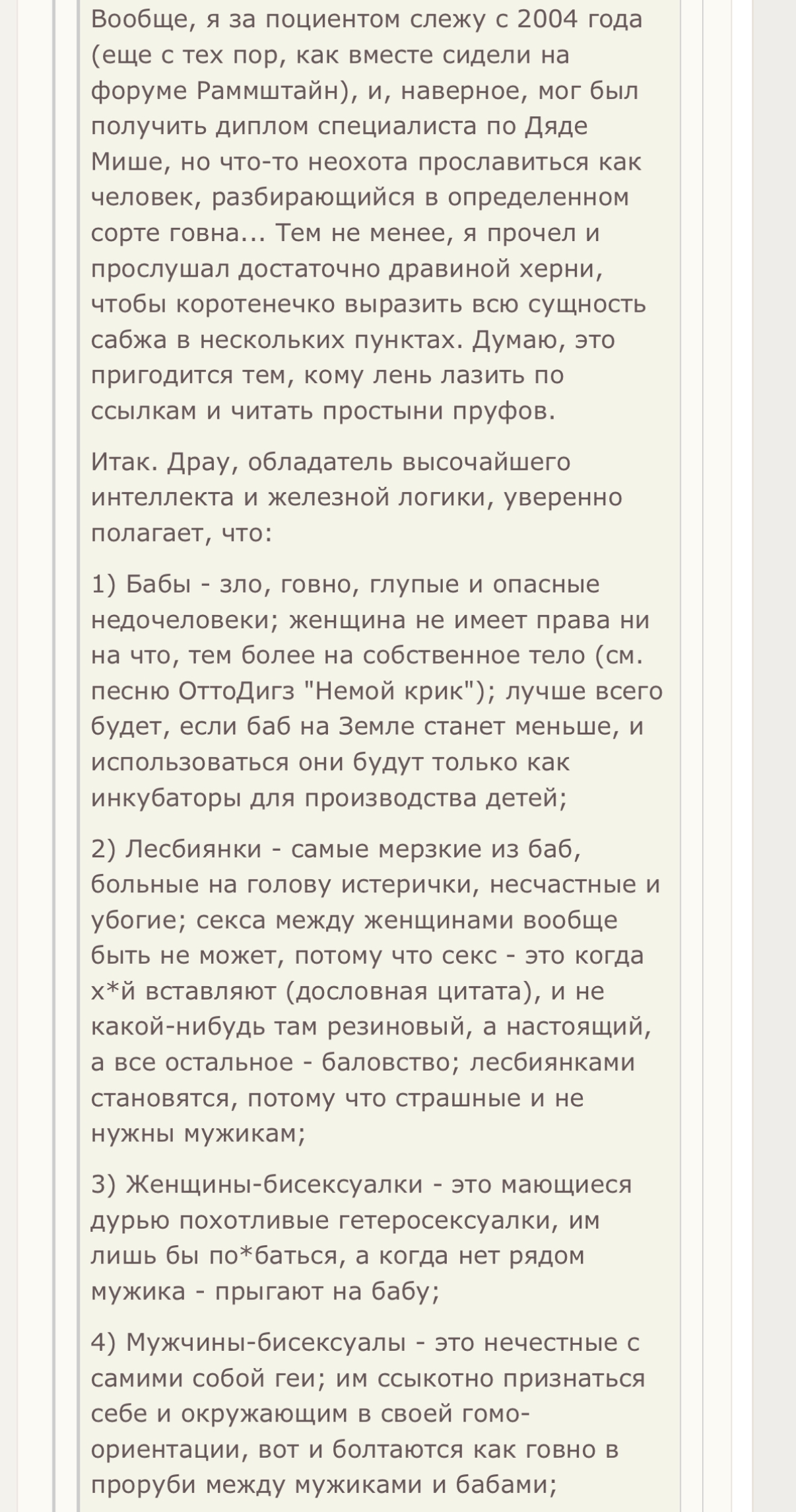 Да я не про слипа, а про фанаток. Со слипом там всё понятно, плюс к тому у него там какие-то свои батя ишьюс вроде были, еот с диктаторскими замашками, ставшая чушком, это для него наверное чисто пляски на мозолях хотя я хз, может для кунов даже фтмские бас и борода не меняют восприятие. Как в свою очередь и его отношение к ней и к её идеям и даже творчеству, по типу когда надоедает трушная поэзия, можно почитать милые потуги от сисика писика в стихи, утютю смотрите сисик пытается рифмовать)))) какая няша)))