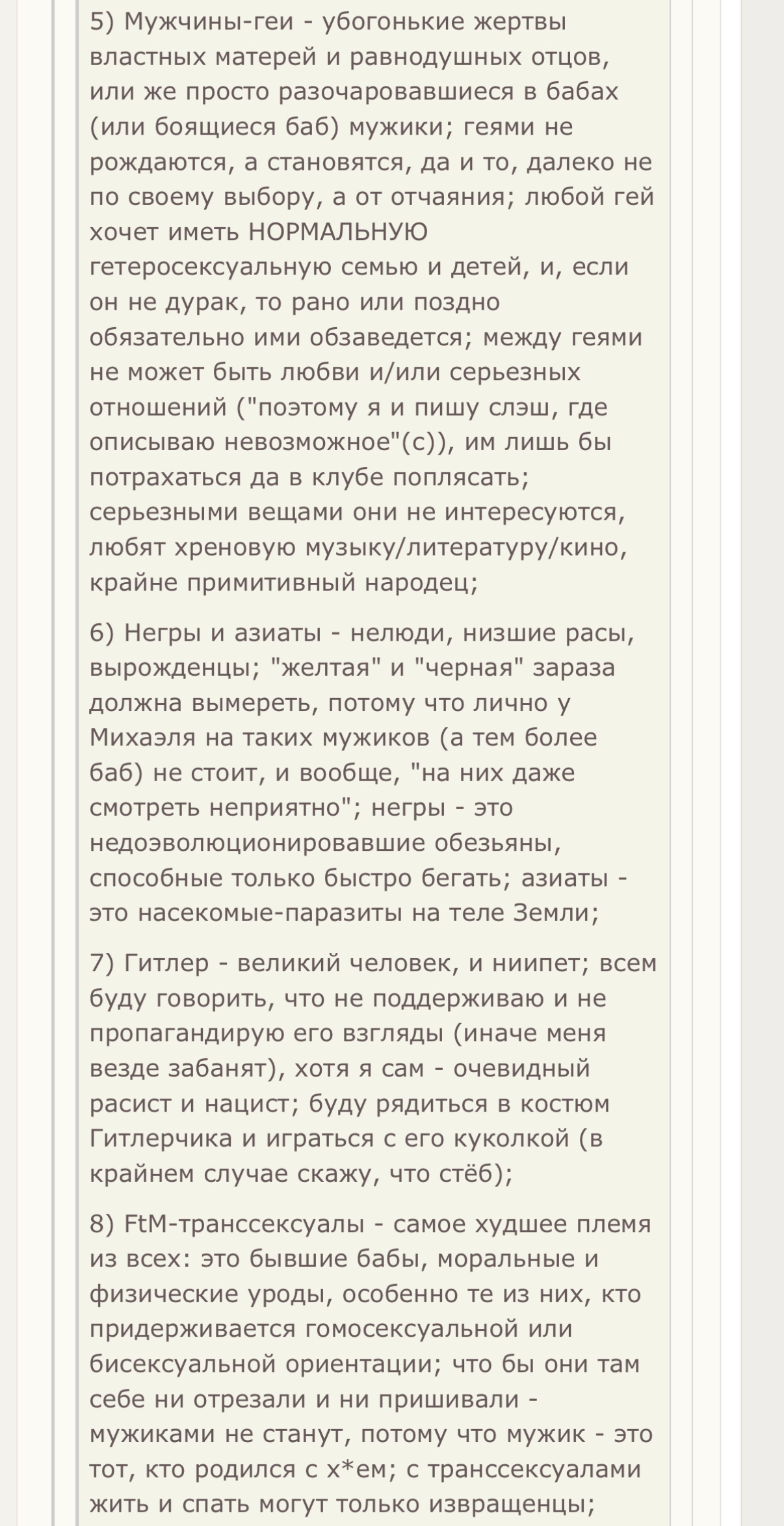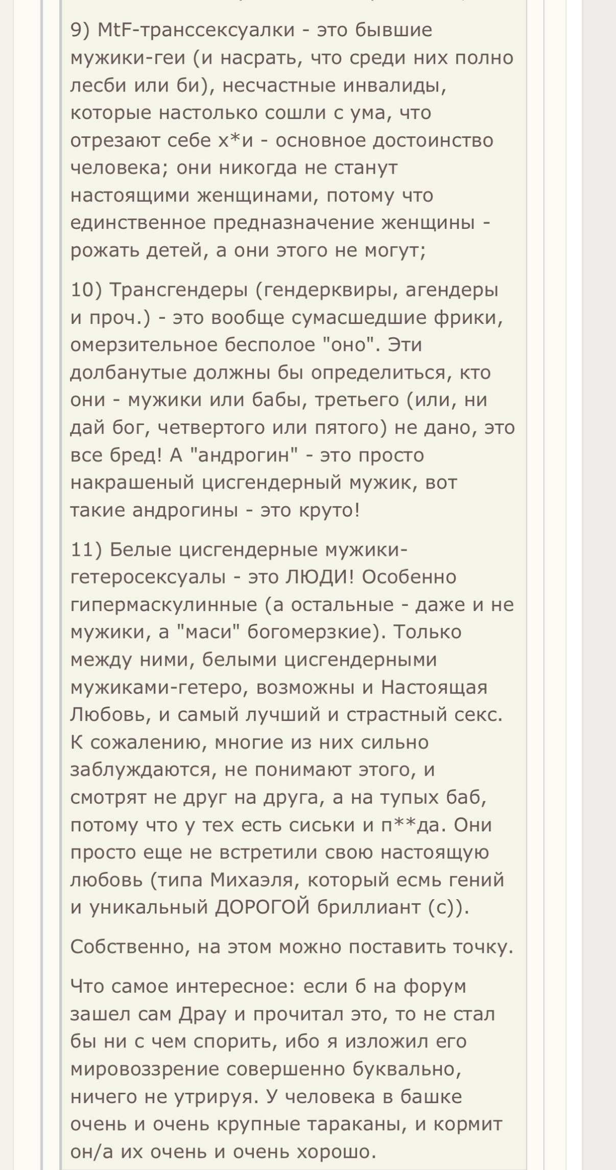 >И да, он себя часто как дебил ведет во время таких вот высказываний, которые касаются пола, гендера и многих других тем. Лицемерие и противоречие, нарушение в логике тоже, пробивают насквозь все мыслимые и немыслимые рамки, стены, полы и потолки, двери и окна, НО, лично я этому явлению ничуть не удивляюсь. Как он может быть адекватным человеком, если с детства самого живет в настолько тупом социуме!? Социуме, которое даже не способно понять, что это ОН! Мне почему то - я ж блть даже догадаться не могу почему - а так кажеться, что далеко не он один виноват в том, что немного тупой. Учитывая, сколько таких вот индивидуумов как вы его окружат - вообще нет удивления, почему он часто хйню несет и брызгает ненавитьсю как на многие темы, так и в адрес многих категорий людей. Он, как и многие другие люди, является просто всего лишь неосознанным отражением того мира в котором он сам живет и обитает. И глядя на всю эту среду... Я НЕ ВИЖУ ИСТОЧНИКА ИЛИ МЕСТА, ГДЕ ОН МОГ БЫ ПОДХВАТИТЬ ЧТО-ТО ХОРОШЕЕ! ВОТ БЛ*ТЬ В УПОР СМОТРЮ, РАССМАТРИВАЮ ЭТОТ МИР ТАК, ЧТО АЖ ГЛАЗА ВЫЛАЗЯТ ИЗ ОРБИТ, НО КАКИХ НИБУДЬ ИСТОЧНИКОВ ГРАМОТНОСТИ, ГАРМОНИИ, МУДРОСТИ И СВЕТЛОГО УМА НЕ ВИЖУ! НЕ ВИЖУ! ВСЕ ТУПЫЕ! ВСЕ! ПОТОМУ ЧТО ПОНЯТЬ НЕ МОГУТ, ЧТО ЭТО ОН! ТУПИЦЫ БЛЯТЬ! НУ ПИЗДЕЦ ПРОСТО КАКОЙ-ТО! - ДАЖЕ НЕ ПИЗДЕЦ, А ПИЗДИЩЕ ПОЛНОЕ НАХУЙ!!!! Короче... Его то мы сотни тысяч раз осудим по разному, СНОВА СКАЖЕМ ЧТО ЭТО ОНА РАДИ РОФЛА! МАРИНКОЙ НАЗОВЕМ! ОСКОРБИМ ЕЩЕ КАК-ТО! А потом вместе хором будем удивляемся, а чего это ОН, эп твою мать, такой неадекватный!? НА СЕБЯ ПОСМОТРИТЕ! Для начала.