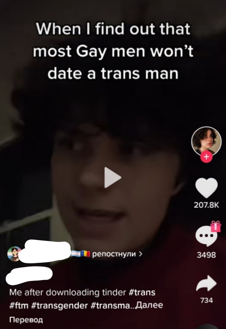 >>6141483 Не половина, наверное, меньше. Но у них есть объективные причины, смена пола позволит им создать традиционный брак со всеми привилегиями. А у фтм причина лишь в ненависти, и никаких профитов они не получают, потому что своим любимым геям они не нужны. Видела тик ток одного гея, который честно сказал, что они с куном иногда приглашают в пару фтм на секс втроём, но только если у фтм сделан член. Под этим тик током было много гневных постов от фтм, у которых нет денег сделать себе член, это очень дорого.