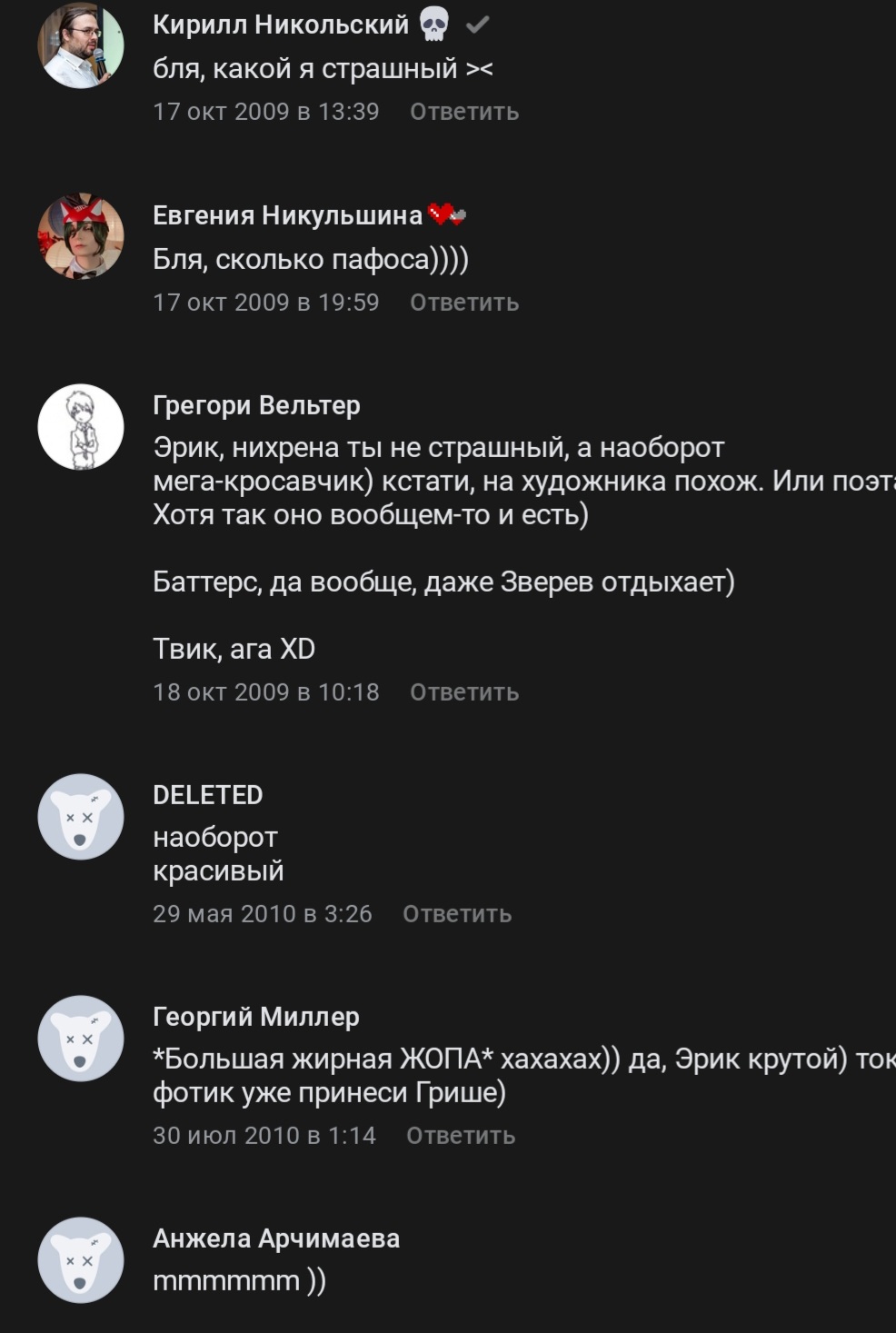>>6142297 Я так ору, когда захожу в «Подслушано МояМухосрань», а там взрослые мужики и бабы до сих пор пишут на падонкаффском. Не хватает только упячки и ЗаБоРчЕгГгА. Так и хочется спросить «Ти ЭмО4кО?*». Это вам не тиктоки глумливых детей про карла и кофе, а уже глубокая древность, что-то типа мезозойской эры. Мне всегда интересно в курсе ли они, что так больше не общаюццо хДДД? Или считают это своей фишкой, которую не секут ламеры молодые.