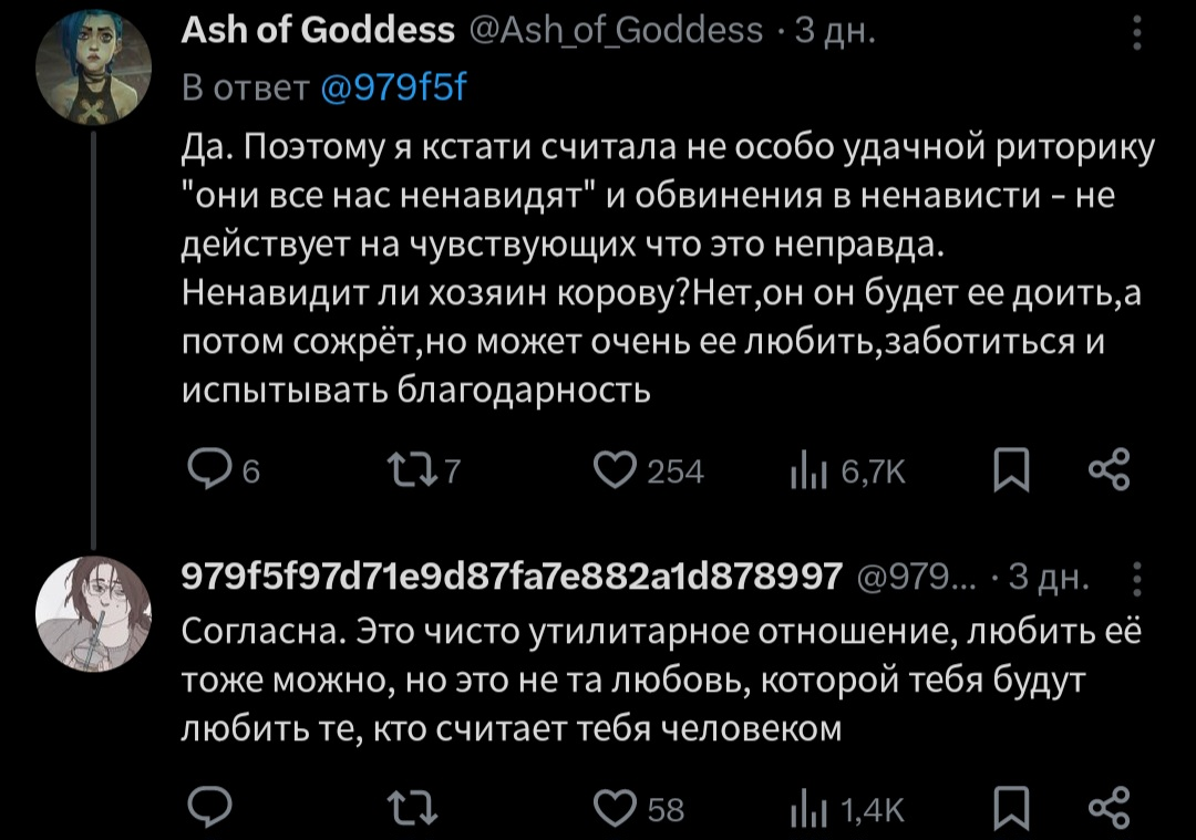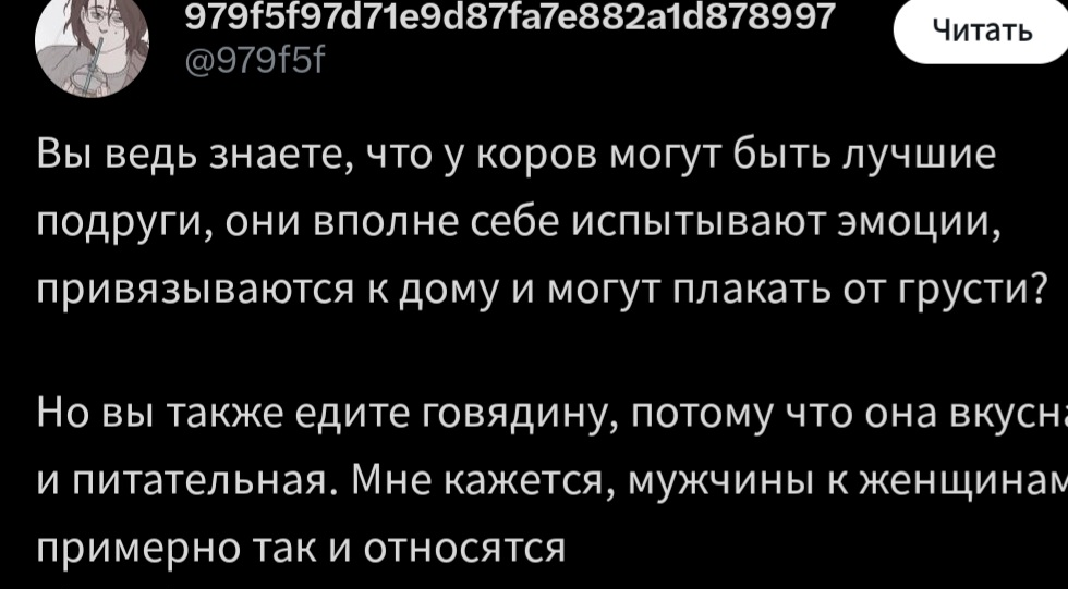 Я не хочу нести ненависть к мизерной группе людей, которые никого не трогают и хотят менять конкретно свои тела. Но почему внутри их головы желания об износе мужчинами, а переход это путь стать подходящим объектом для этого... почему они видят женщин и женственность ТАК? Почему их не осуждают за такие мысли, ведь реальные жизни реально страдают от таких даже не знаю как это назвать опасных предрассудков. Хотя конечно эту картину мира распространяют патриархальные установки, а не трансы