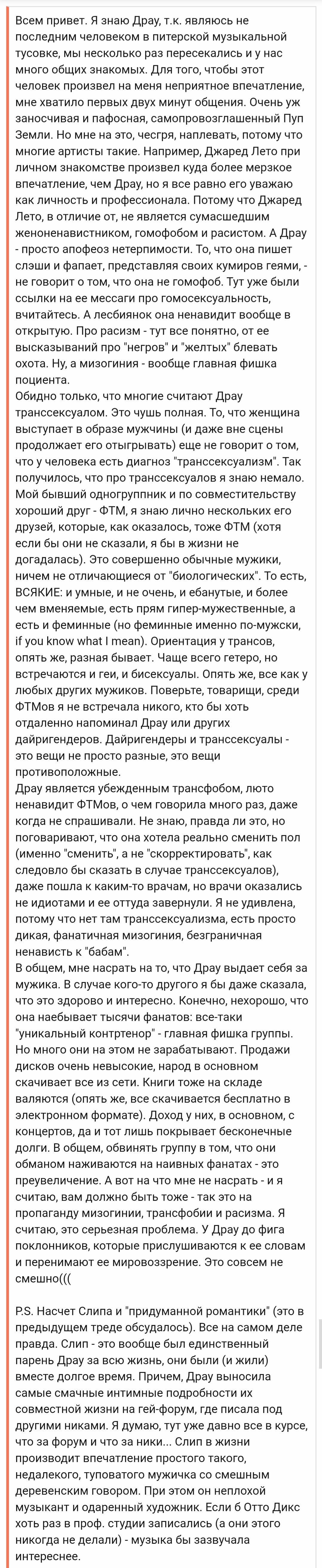 Я раньше (до 2022) была подписана на пару каналов с фтмами. И они выглядели с виду как обычные люди, которые занимались обычной жизнью, работали, путешествовали, заводили пары и даже не засовывали дилдак в штаны и не вели каналы уровня "умные мысли дяди Больжедора про сиськи письки общество и человечество". Ну иногда что-то там могли запостить, но это выглядело легко и с иронией. Короче говоря, они казались более счастливыми, чем Драу. Что ж, наверное я не права и просто не знаю, что у них в это время было в голове. Может быть они просто не вываливают всё напоказ и коупят. Может быть у них был и какой-то другой путь к счастью, или они просто такие люди сами по себе, с более крепкой психикой. Может быть вся разница только в акцентуации характера, поэтому я в случаях тех фтмов воспринимала дисфорию как дисфорию, а здесь как внутреннюю мизогинию из-за гендерных стереотипов. Сейчас уже не берусь смело об этом говорить или как-то разграничивать. Пусть этим всем занимаются более умные, специально отведённые для этого люди.