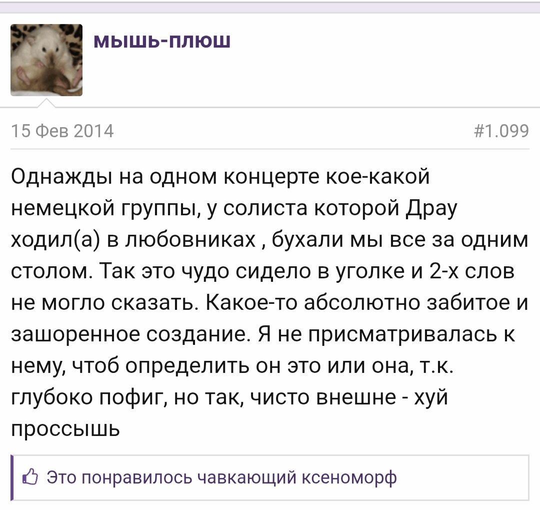 >>6142793 Ой блять. Ей нравился видимо один кунчик, она ему простынями срала на стене вконтаче, если помните такое явление, а этот чел однажды где-то мне в комментах ответил разок или в моем вконтаче чето прокомментировал, я толком и не помню, потому что не общалась с ним даже. Ну там фантазия видимо разыграла сюжет дальше, ее-то он игнорит, а мне отвечает, значит мы тайно ебемся и тд. и вообще я тварь разлучница. Ебнуться крч. Я вообще не думала что ей куны нравятся почему-то.