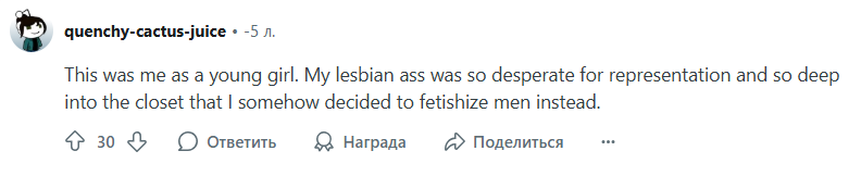 Если помните, в американских фильмах есть троп - когда оказывается, что какая-то женщина в студенческие годы встречалась с другой женщиной. В «Скотт Пилигримм против всех» такой точно есть, но его в основном в комедиях используют. И женщина обычно на это отвечает «ну, мы тогда экспериментировали». Популяризация яоя и интернет просто дали возможность развиться ещё одной ветке таких экспериментов. Кто-то как драва потёк кукушкой и закостенел в этом состоянии, а большинство переросли этот период. Сейчас тоже такие девочки есть, несмотря на феминизм и репрезентацию сильных женщин.