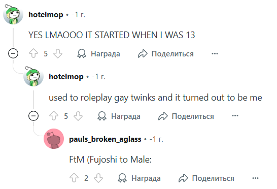 Овсянка и Итить кстати тоже начинали с пиздежа, что они парни. Удивительно, что людям проще обколоться гормонами и изрезаться за бешеные бабки, чем признать пиздеж