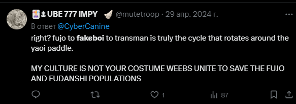 >>6144692 Короче я ничего не нашла четкого, возможно у них этого сленга, а возможно это кринж в 2025, типо обзывательство для ftm, но вот что я нашла: she’s not really gay, she’s just LARPing as a sad gay boy for attention young weird fujoshi girls rp as gay men online