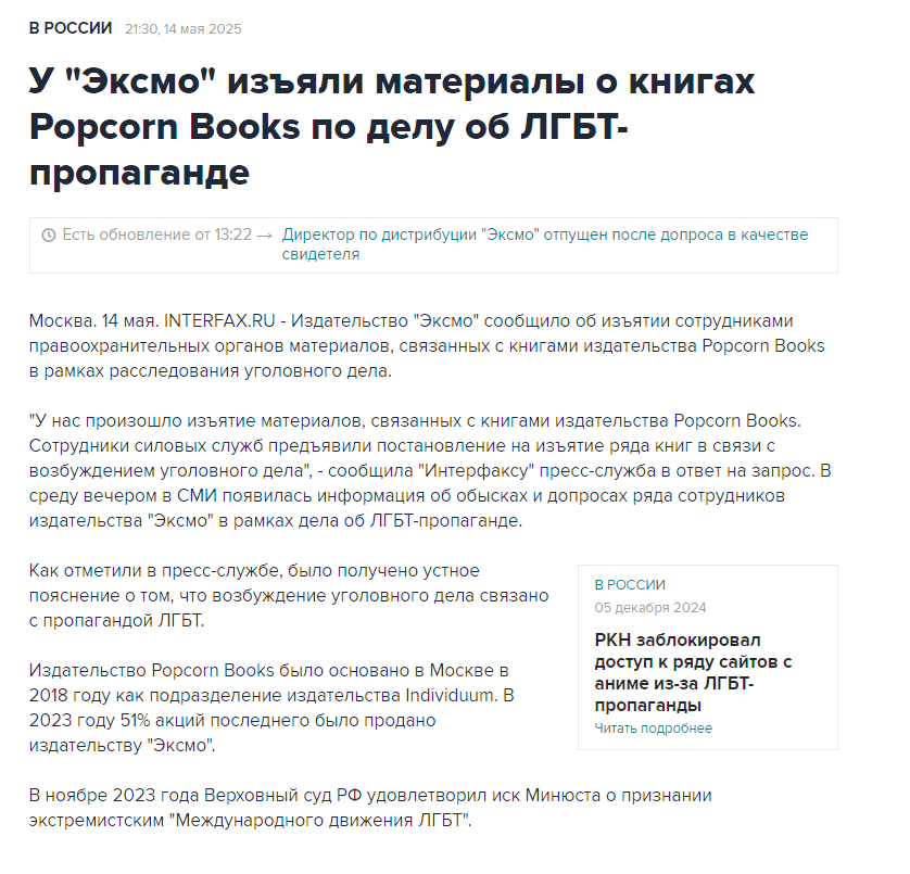>>6120329 Эксмо за издание книг попкорн букс. Попкорн букс выпускал только ЛГБТ в основном. Мы пережили несколько кризисов, когда яой сделали с маркировкой 18+, когда яой со школьниками приравняли к цп, теперь что яой вообще нелегален как и живые геи. Вот так..