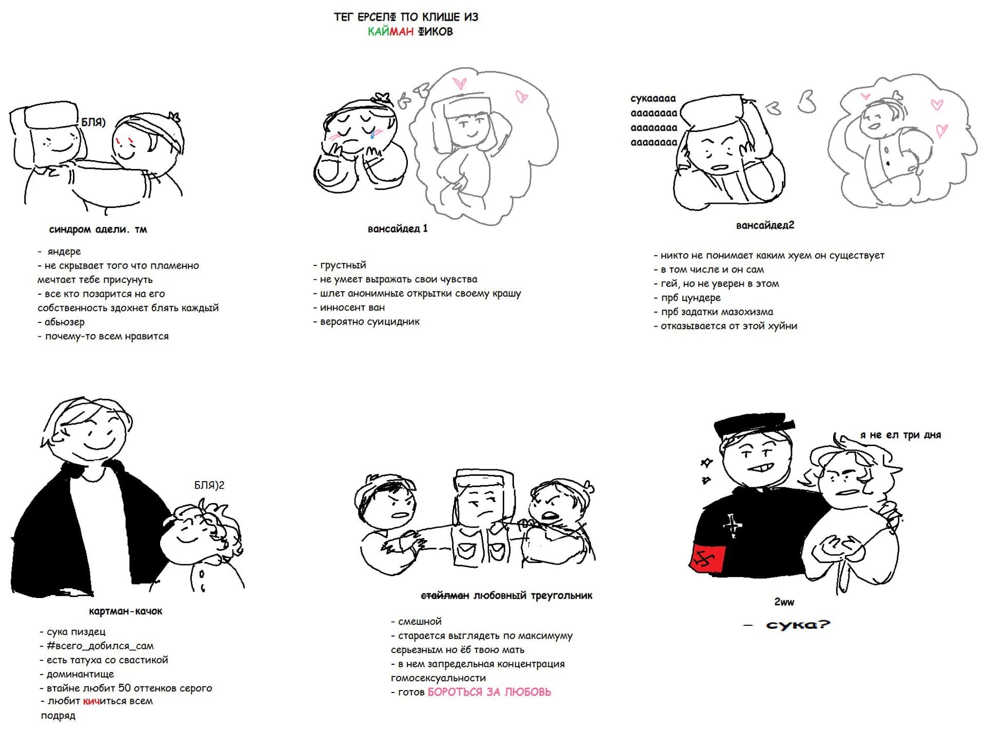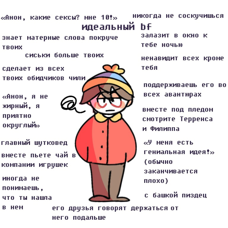 Любимый ООС это шота месугаки Эричка. >>6122202 +, Венди химичит с Картманом не хуже >>6122373 Я бы назвала Картмана американцем в пределе своего развития, то бишь это психопат который эволюционирует либо в бизнесмена, либо в массшутера. Ориджинал взрослый Картман был бизнесменом как раз, но в Южном парке на протяжении сезонов характеры персонажей непостоянные, они не столько развиваются, сколько меняются по прихоти Мэтта и Трея. Картман психом тоже был не всегда и начинал как избалованный ребенок. И шизофрения которая с Картманом в последних сезонах происходит мне не понятна и желание смотреть эти серии отсутсвует.