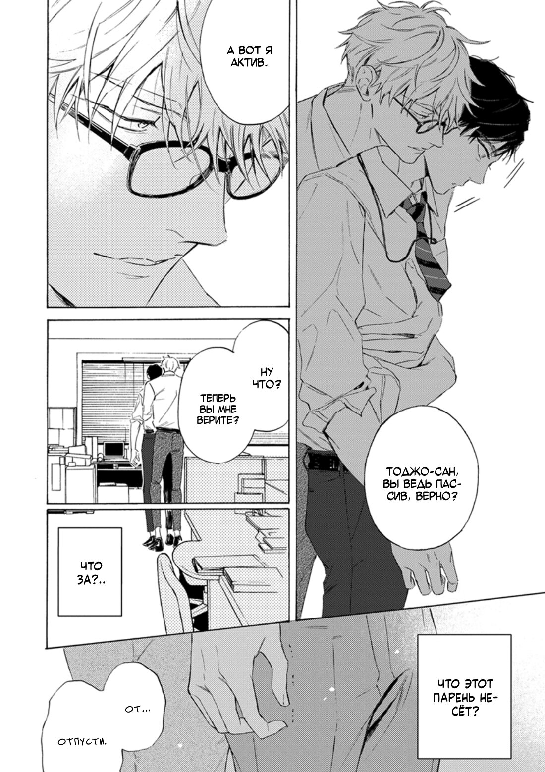 >>6127057 Я посмотрела эту сцену, довольно милая, в 3 серии. Там другие парни, не те, что на обложке. В очках начинает гладить второго по промежности, а второй говорит "Наши отношения не могут быть завязаны только на этом", а в очках отвечает "Но тебе же нравится". И потом они порятся в жопу минуты две.