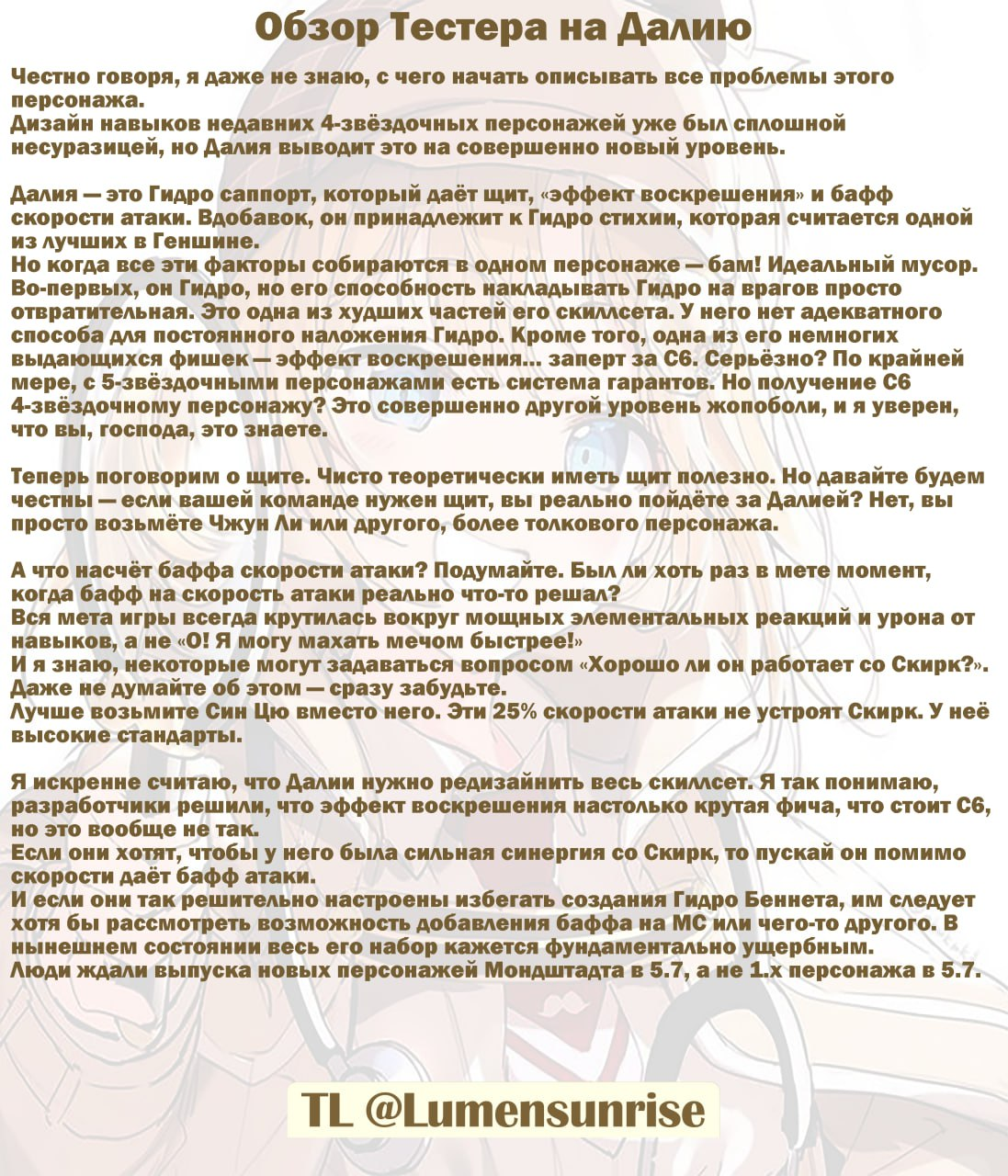 Короче, сисы, похожу я не буду крутить Далию, соответсвенно и Скирк тоже. Я очень долго ждала Далию, но его сделали таким мусором, что даже на с6 вдохнуть копиума не получится. Это просто гадство, самое подлейшее гадство. Вы даже не представляете, как я растроена и огорчена. Я его так сильно ждала... и мне даже не нужен был имбовый персонаж. Нет. Просто был бы хоть копиумно играбельый, я бы стерпела, накрутила бы себе с6 и похуй. Даже если бы он был на уровне... не знаю, Дори там - я бы уже была рада. Но такое дерьмо невозможно никаким фажеством оправдать. Он даже в попене будет последним инвалидом. Ему дажеанимации скиллов нормальные поленились прикрутить. Просто каловый кал калового кала. Как же хуево это осозновать. Так что идет Ляо нахер со своей хонкалоидной пиздой. Похуй даже, что новая повариха выпала с первой десятки.