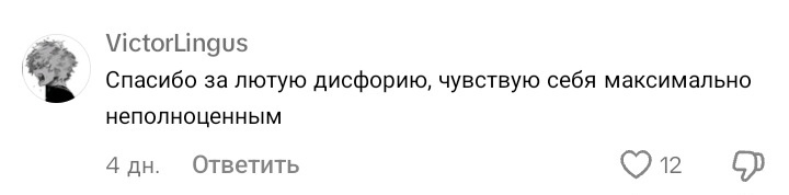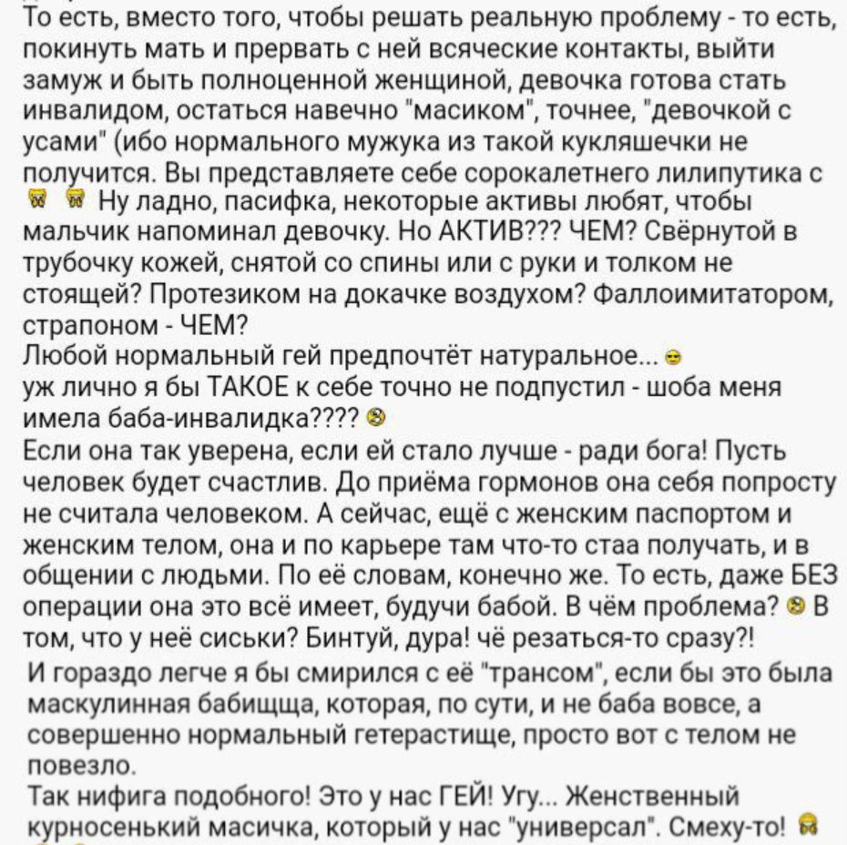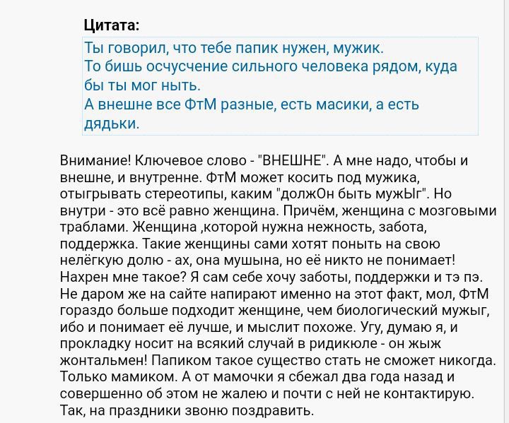 Вообще смешно читать всё это, зная сколько знакомых «тру лесбух» в итоге огетерасились и уже нарожали детей от своих кунов. А ещё лет 5 назад говорили, что строго по девочкам, а на мужчин даже внимания не обращают. Даже есть такая знакомая радфем, которая вышла замуж, но продолжает сидеть в радфем пабликах и воевать с мужиками в твиттере. Никому нигде не жмёт в итоге.