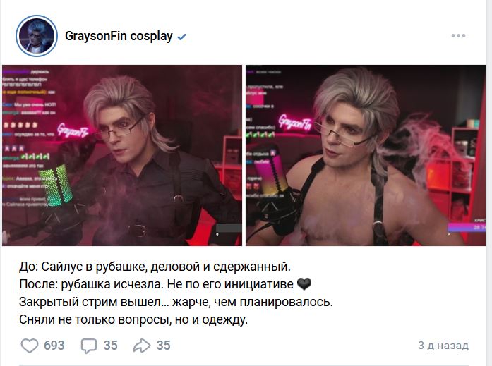 >>6163965 >>6163980 Женя Грейсон Фин, известен тем что он вроде как ватан и на него за это ополчилась Овсянка и ко в 2022. А ещё известен тем, что на /фд треды с ним и его женой трут через секунду, потому что Грейсон вроде дружит с Абу. Делает пидорские косплеи со вторым мужиком, Штейном чё-то там имя не помню. Оба натуралы, Женя женат на Ксюше Камико Зеро. Оба в какой-то момент вкатились в эрокосплей за бабки. Делают хайповое типа Астариона и Гейла или Геральта и Лютика. Вот катом ссылка на вк https://vk.com/graysonfincos