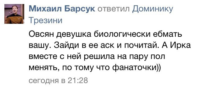 >>6164259 Точно, сиса! >вот вам и профем-бурят Так у него много таких охуительных тейков было. И про женщин, и что настоящие пидоры никогда не будут считать фтм геями и он не понимает, нахуя фтм к нему клеятся, и про фанючек что-то. Пидор почти всегда означает что он ненавидит женщин.