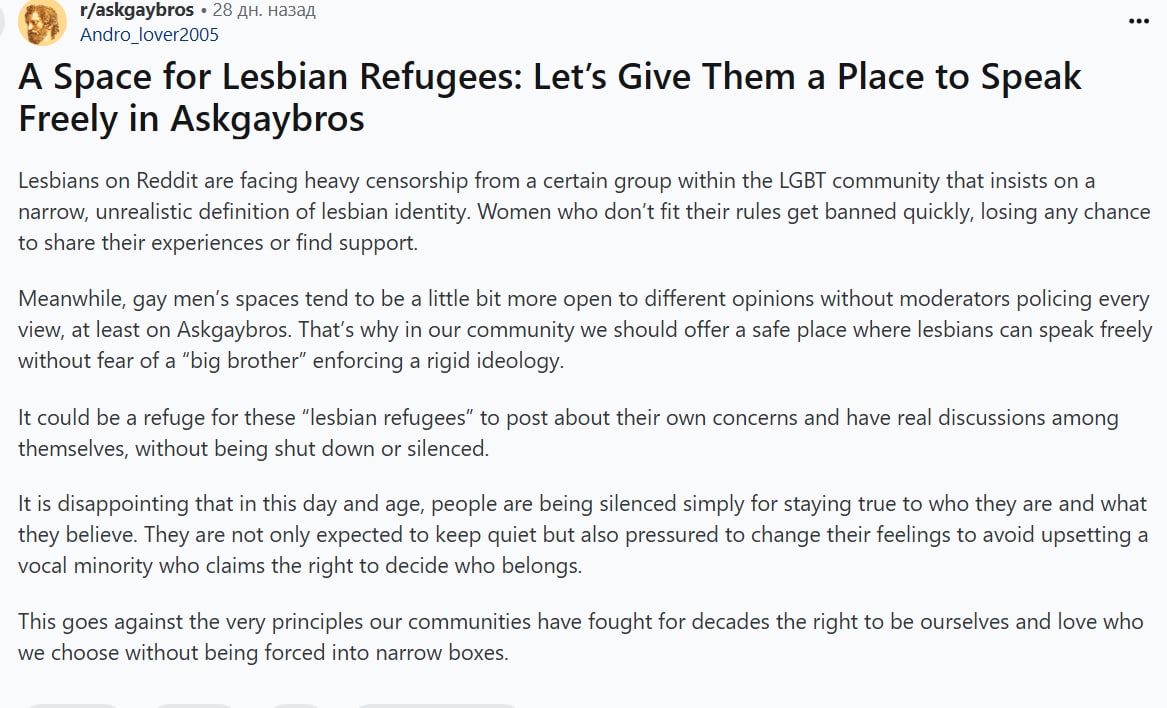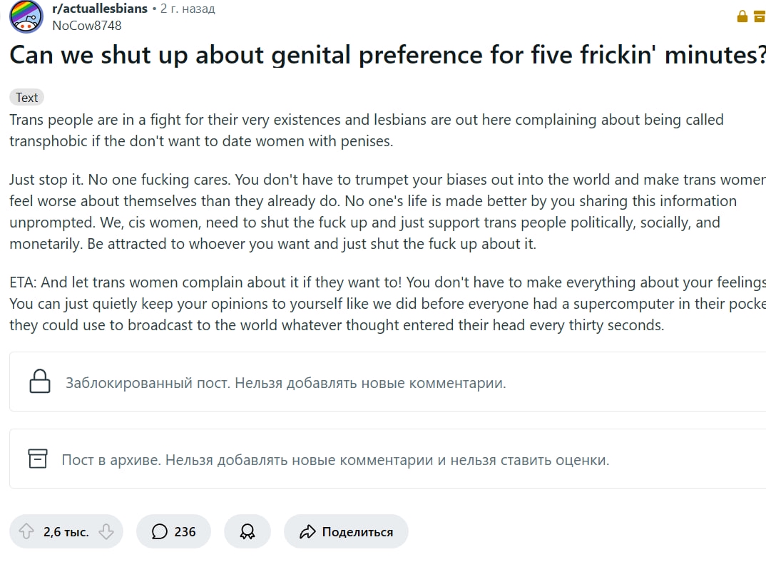 Чеканье предпочтений в крупнейшем соо на реддите для "лесб". Для тебя как гетры это неинтересно, но для феминисток которые не хотят взаимодействовать с мужчинами - да