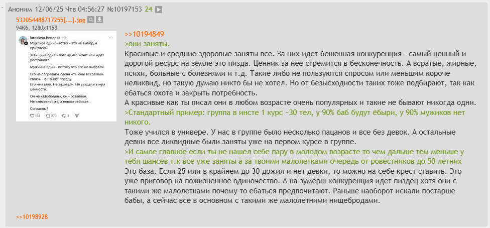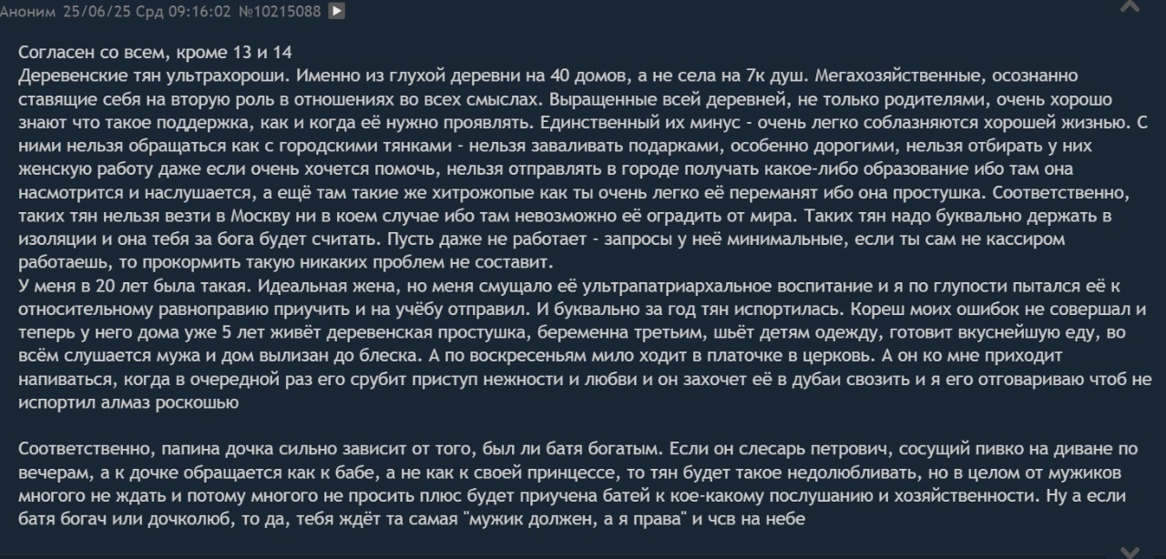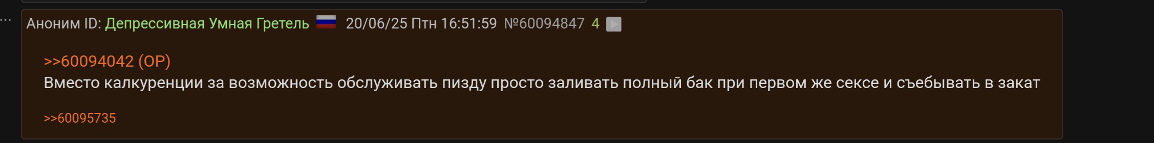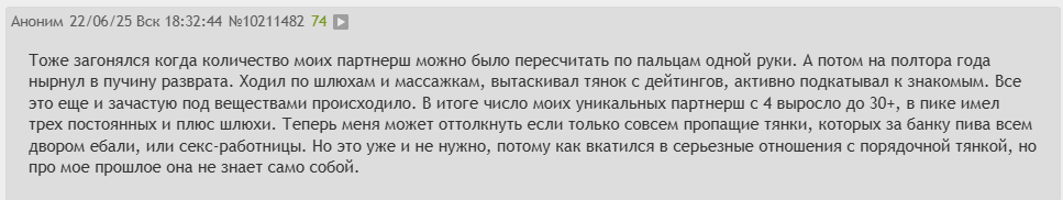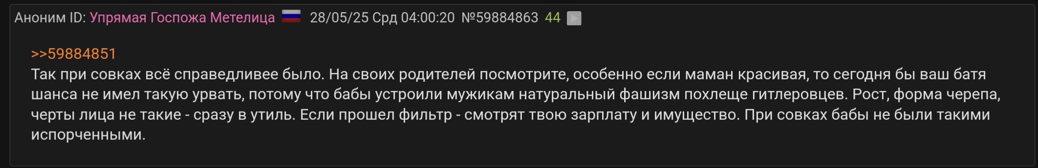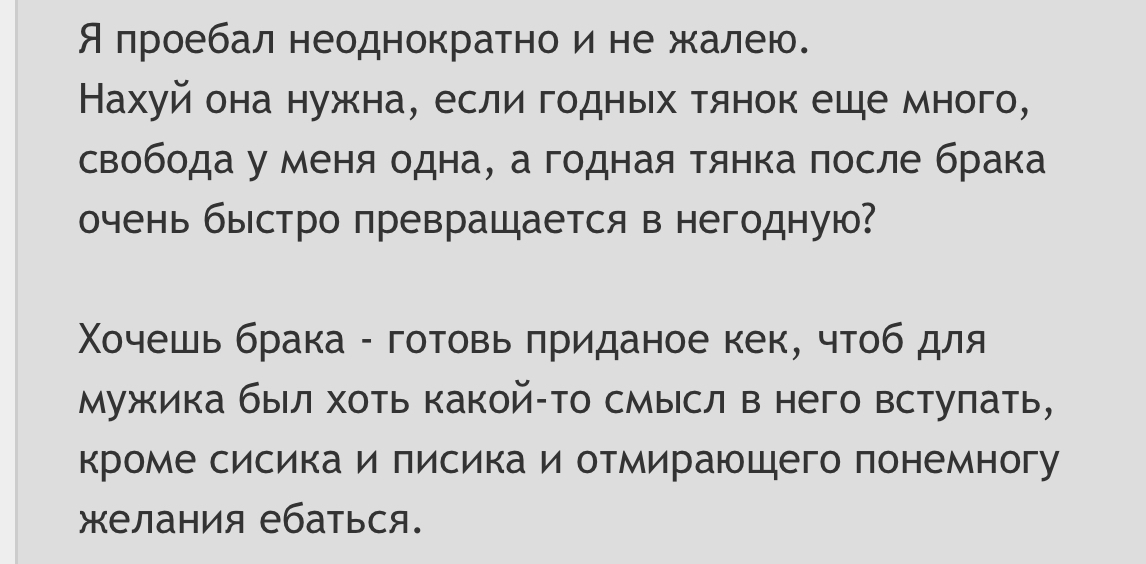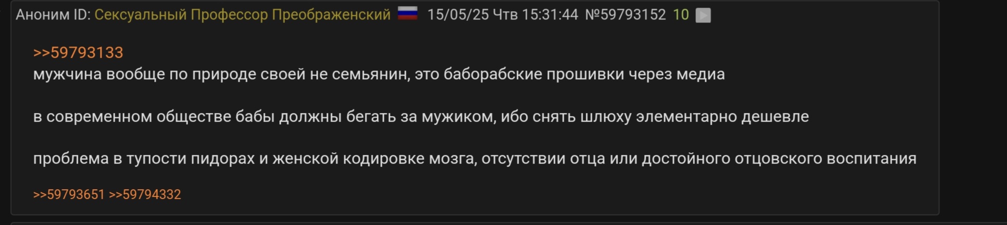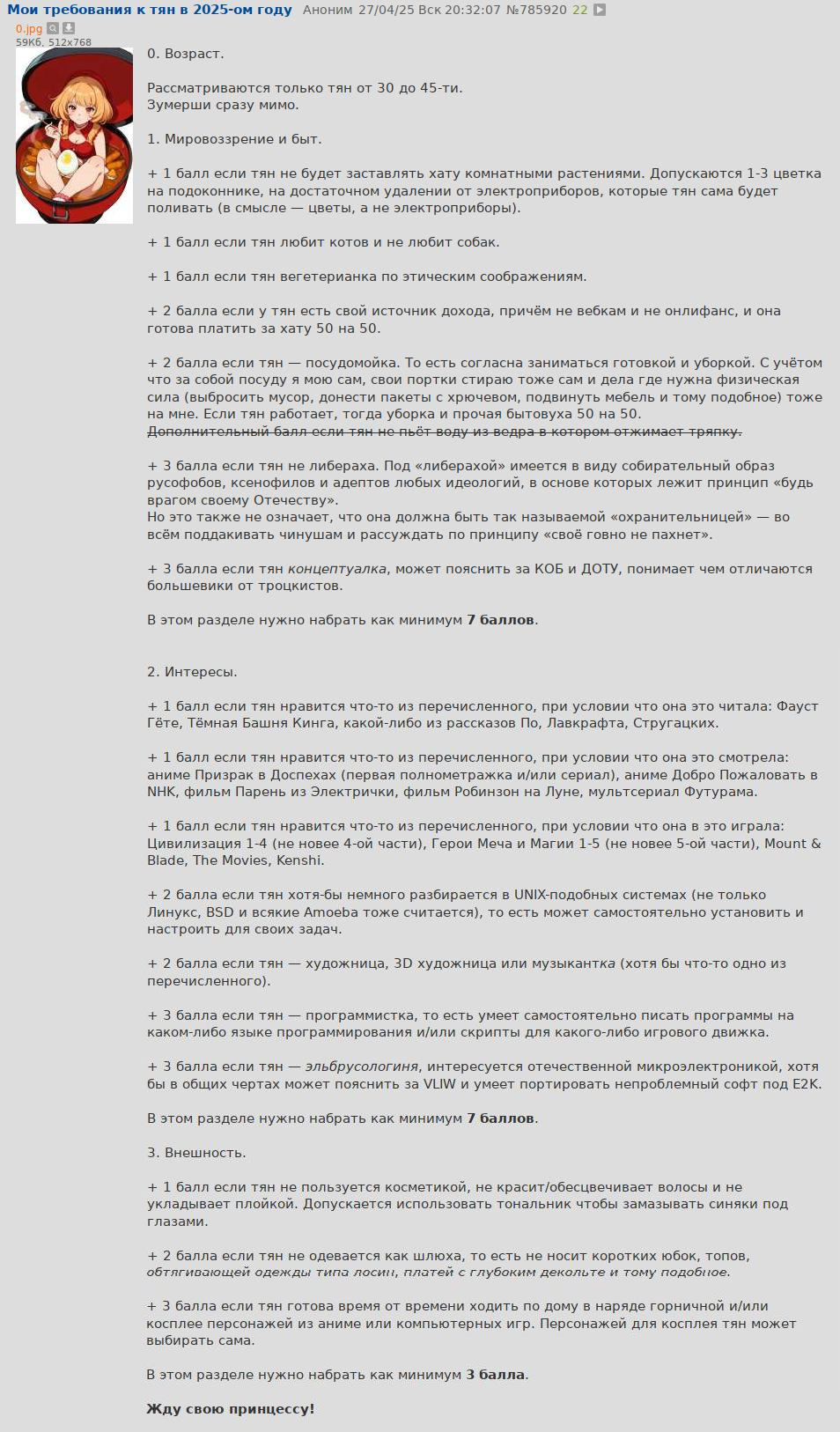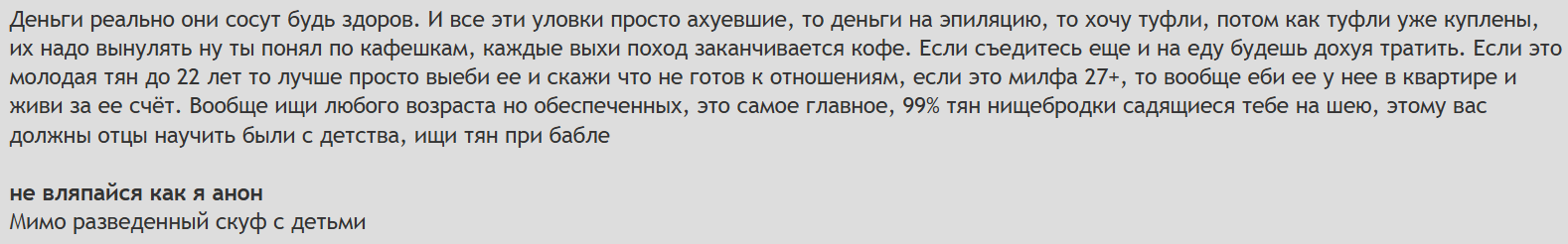 >>6173848 Почему вы в этом треде скидываете какую то безобидную хуйню? В интернете полно по истинне ужасных мизогинных высеров, призывов к насилию над женщинами и т.д. А вы постите как то безобидные анкеты. Вот мой анализ: Требование к возрасту адекватные. Человек ищет равного парнера, а не тупую малолетку . Это хорошо 1. Пункт про растения какая то шиза. Растения полезны для чистоты воздуха в квартире. Ну ладно, тут можно найти компромисс 2 и 3 Хороший пункт. Хороший человек будет любить животных, иметь эмптаию 4. Пункт про источник дохода тоже хороший. Плохо, когда женщина зависима от мужика полностью и несомостоятельна. Это даёт мужику власть над тян, она становится от него зависима, ей придется терпеть от него всякое говно, потому что без него умрёт с голоду на морозе. 5. Пункт про распределение обязанностей адекватен. Каждый сам за собой убирает, каждый работает. Я часто встречала мнение, что тян должна и работать и ещё обслуживать мужика в быту. И многие нормиски это делают. Вот в чем проблема 6. Мало инфы чтобы сделать вывод о его полит взглядах, но звучит сомнительно 7. Хороший пункт, он ищет себе не просто дырку для ебли, ему важна личность тян и наличие общих интересов Все остальные пункты тоже Грин флаги по этой же причине Пункт про внешность. Я думаю это тоже хорошо, когда тян не использует кучу адаптивок и принимает свою естественную внешность. Не гонется за каким то патриархалным стандартном надувного бимбоунитаза 10. Пункт про одежду эгоистичный и собственннический с его стороны. 11. Нейтральный пункт. Некоторым тян просто нравится косплей