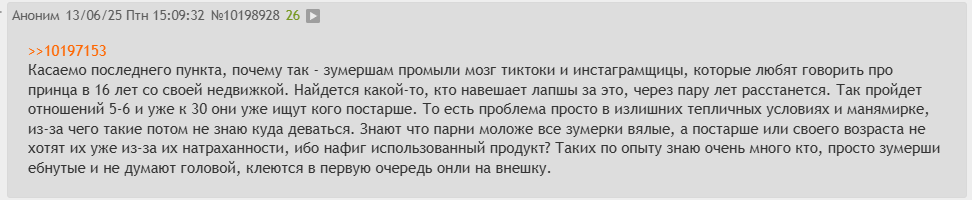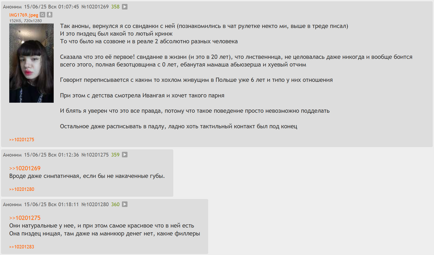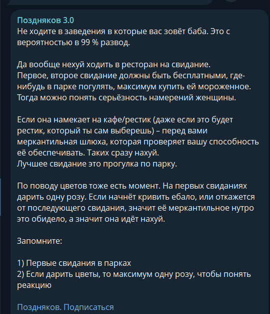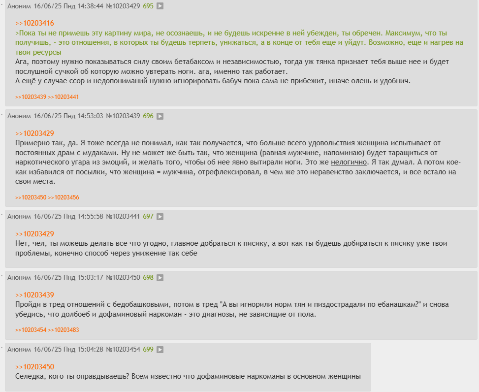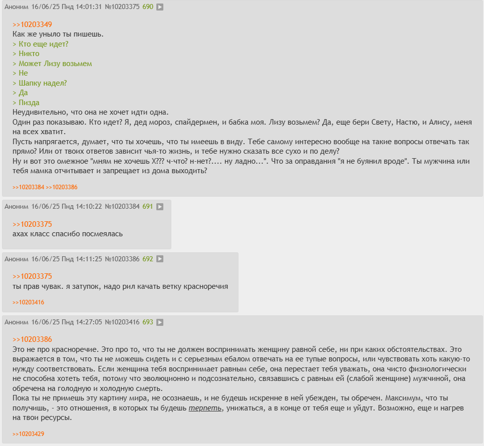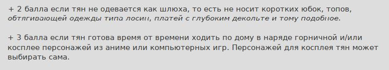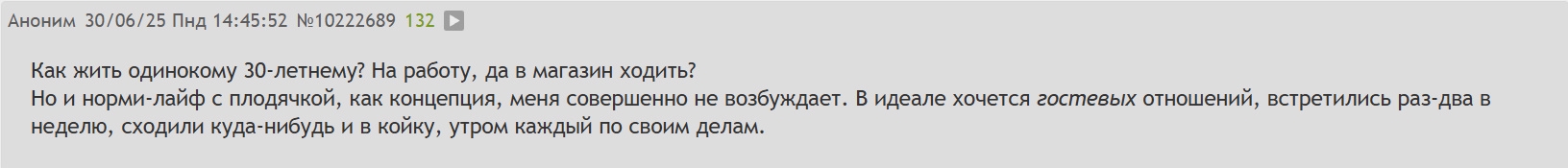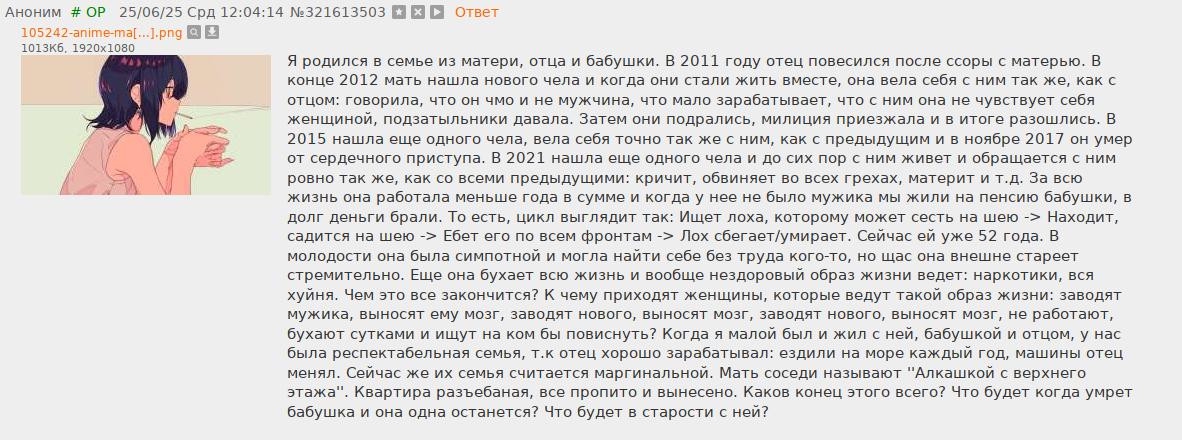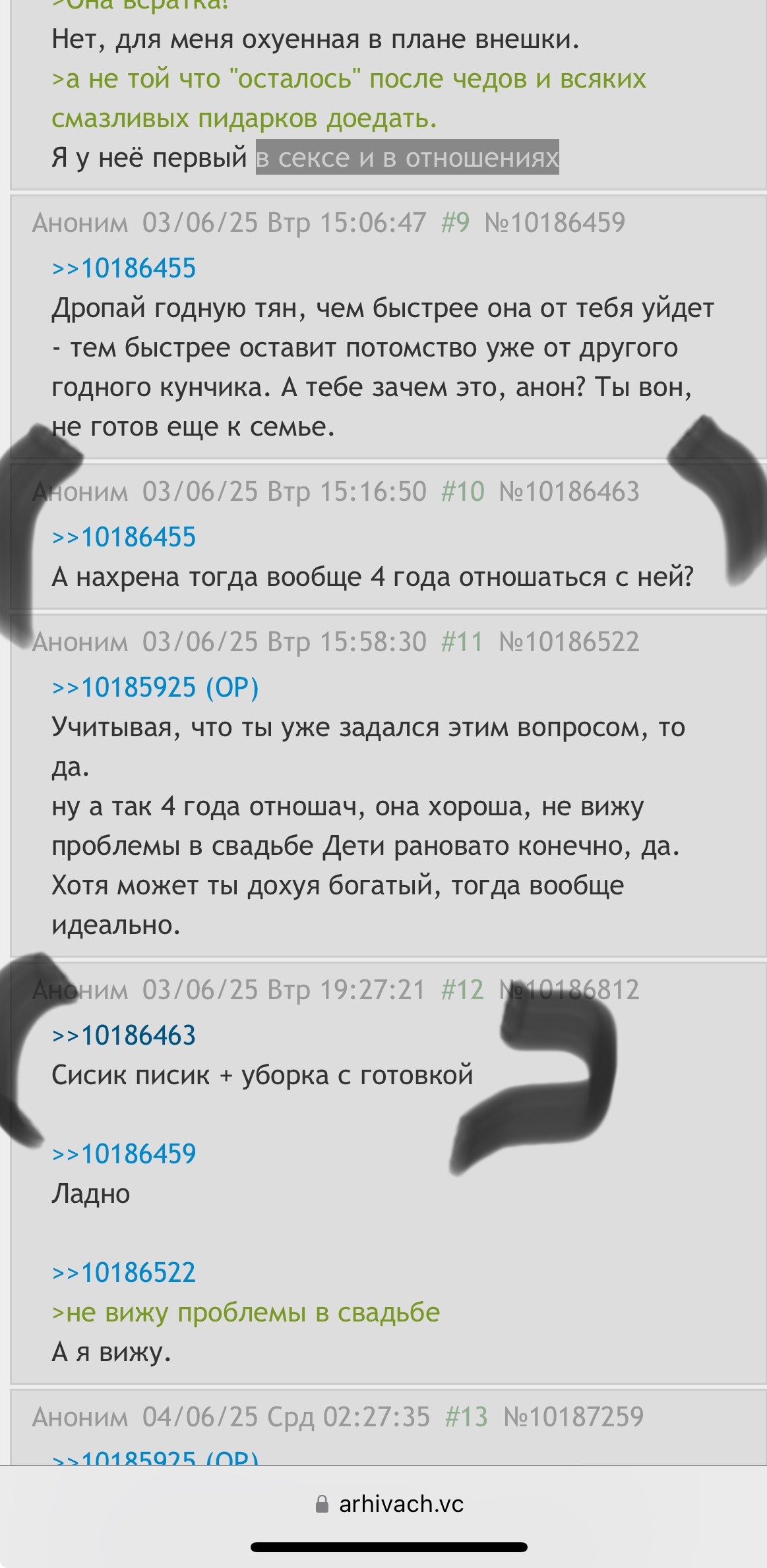 >>6173848 Почему вы в этом треде скидываете какую то безобидную хуйню? В интернете полно по истинне ужасных мизогинных высеров, призывов к насилию над женщинами и т.д. А вы постите как то безобидные анкеты. Вот мой анализ: Требование к возрасту адекватные. Человек ищет равного парнера, а не тупую малолетку . Это хорошо 1. Пункт про растения какая то шиза. Растения полезны для чистоты воздуха в квартире. Ну ладно, тут можно найти компромисс 2 и 3 Хороший пункт. Хороший человек будет любить животных, иметь эмптаию 4. Пункт про источник дохода тоже хороший. Плохо, когда женщина зависима от мужика полностью и несомостоятельна. Это даёт мужику власть над тян, она становится от него зависима, ей придется терпеть от него всякое говно, потому что без него умрёт с голоду на морозе. 5. Пункт про распределение обязанностей адекватен. Каждый сам за собой убирает, каждый работает. Я часто встречала мнение, что тян должна и работать и ещё обслуживать мужика в быту. И многие нормиски это делают. Вот в чем проблема 6. Мало инфы чтобы сделать вывод о его полит взглядах, но звучит сомнительно 7. Хороший пункт, он ищет себе не просто дырку для ебли, ему важна личность тян и наличие общих интересов Все остальные пункты тоже Грин флаги по этой же причине Пункт про внешность. Я думаю это тоже хорошо, когда тян не использует кучу адаптивок и принимает свою естественную внешность. Не гонется за каким то патриархалным стандартном надувного бимбоунитаза 10. Пункт про одежду эгоистичный и собственннический с его стороны. 11. Нейтральный пункт. Некоторым тян просто нравится косплей
