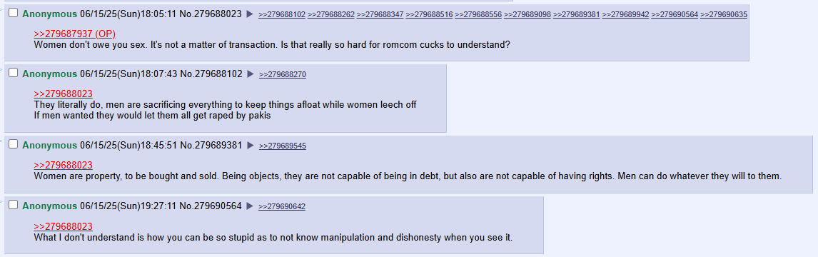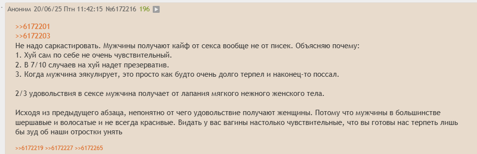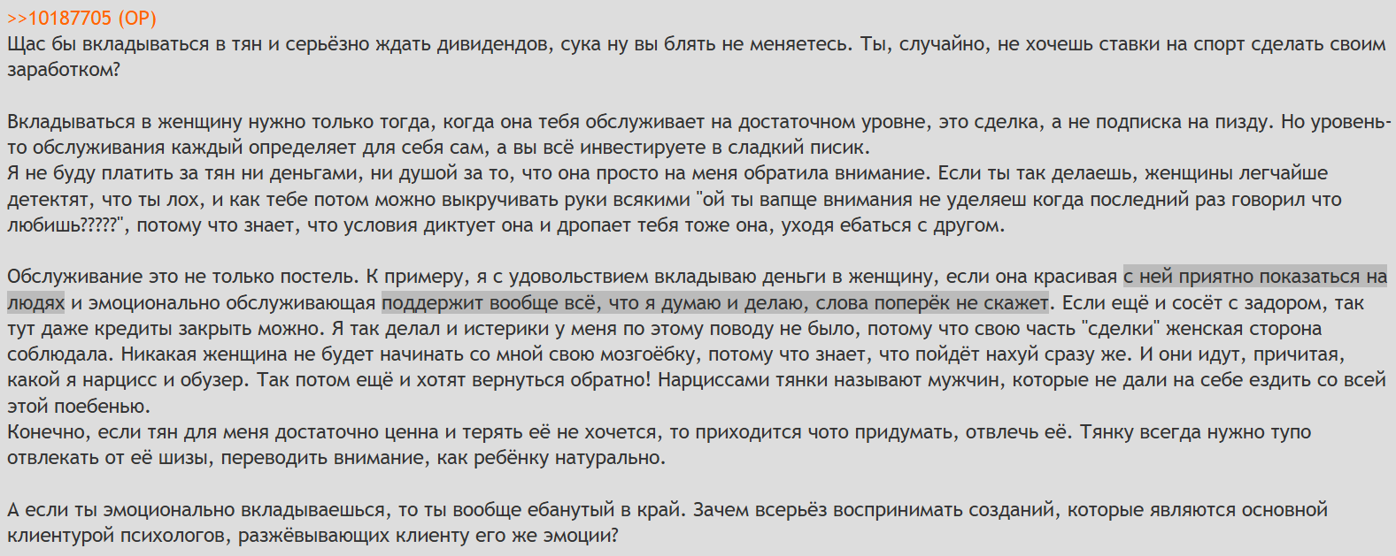 >>6185049 Я не понимаю, что тебе непонятно. Женское тело ценнее мужского по умолчанию, секс - это вложение женщины. Кто так не считает - носит корону равенства и не мужик. Объективная значимость чеда выше, чем у инцeлa, поэтому последний должен вкладывать больше. Если инцeл считает, что заслуживает секса как и чед без вложений, то он рапан и должен фиксить баги.