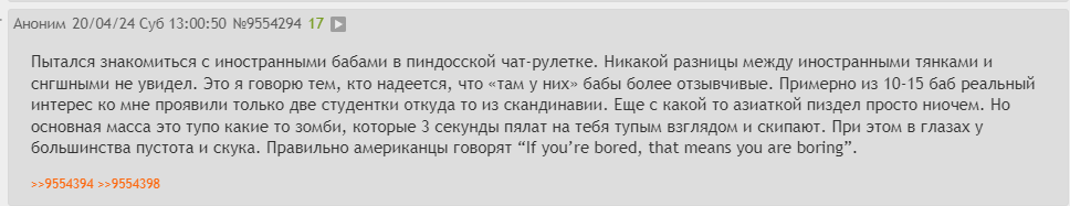 >>6175810 Читала. Там тоже хватает уебашек, но в снг-пространствах подобные кадры встречаются через одного. Грубо говоря, Джон штат Калифорния, который на форче рррякает, что "бабы дуры" - это один дуранчоус из десяти, а ваня, рррякающий аналогичное - это десятый из таких же десяти. Понаблюдайте сами и убедитесь.