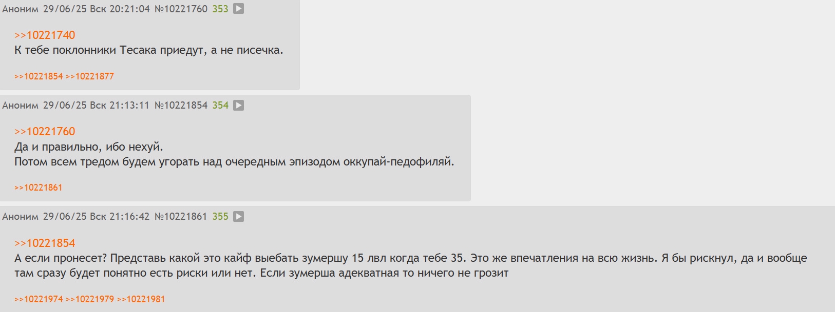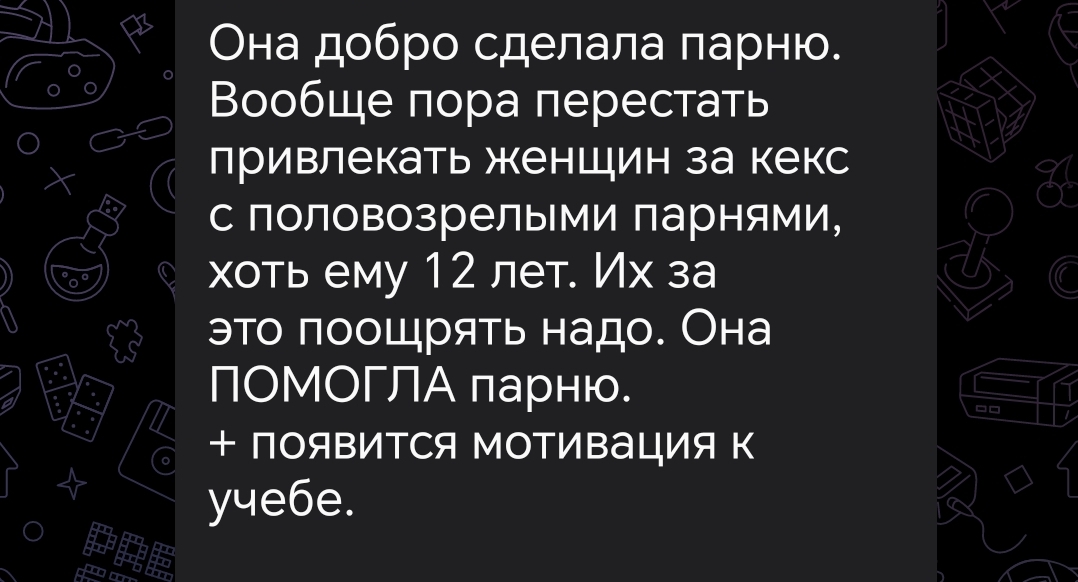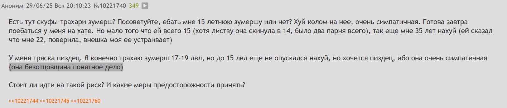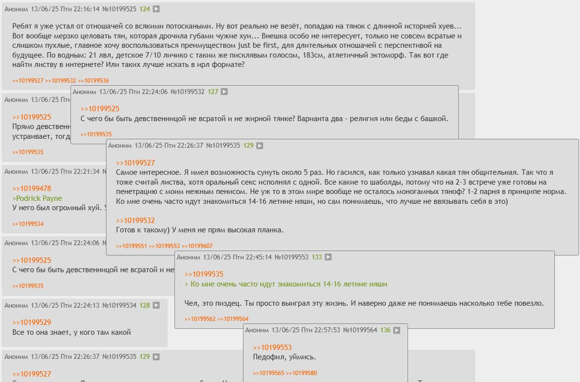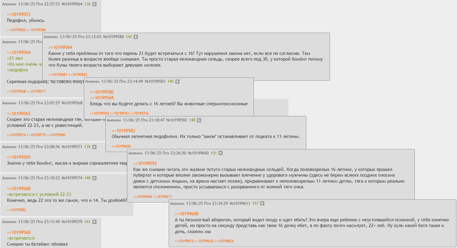 хуи: ежедневно насилуют, лапают тян, большинство случаев даже умалчивается, в 40+ лезут к 14-леткам хуйцелы: а нехуй было ходить не в парандше сама виновата слюха, возраст согласия должен быть 12 лет как в странах десятого мира нахуй