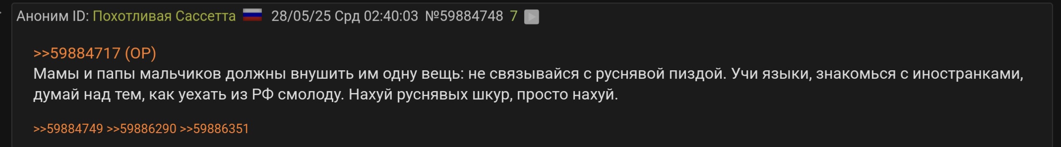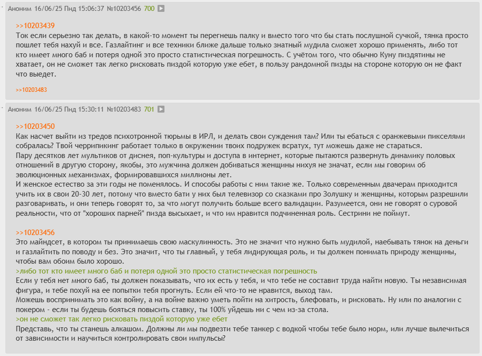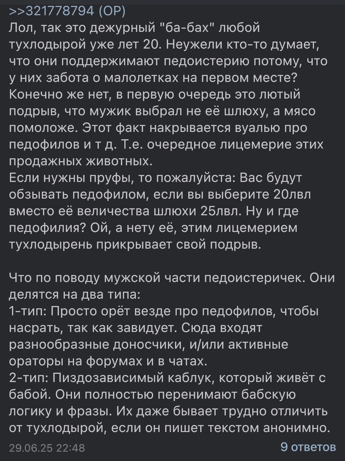 >>6178456 Пока так 3 июня 2025 года житель Нижнего Новгорода приговорен к штрафу за разжигание ненависти к представительницам женского пола. 23-летний мужчина возглавлял группу "Мужское просвещение". Там он занимался распространением мизогинных (женоненавистнических) взглядов на общество.