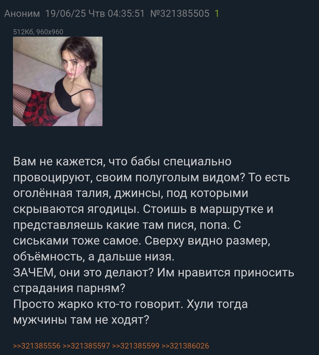 >>6164840 Причем самый рофл в том, что это не просто скуф, это скуф-девственник, которому вот этот стояк вообще без надобности и я реально не выкупаю, нахрена ему надо, чтобы кругом бабы сексуально были одеты, я бы на его месте наоборот хотела бы, чтобы все замотанными ходили, ну прикинь тебе ебаться хочется страшно, вокруг сплошные триггеры, а тебе в итоге никто не дает. Это ж можно ебануться. А он наоборот почему-то к этому стремится...Хз, че у него в больной его башке творится