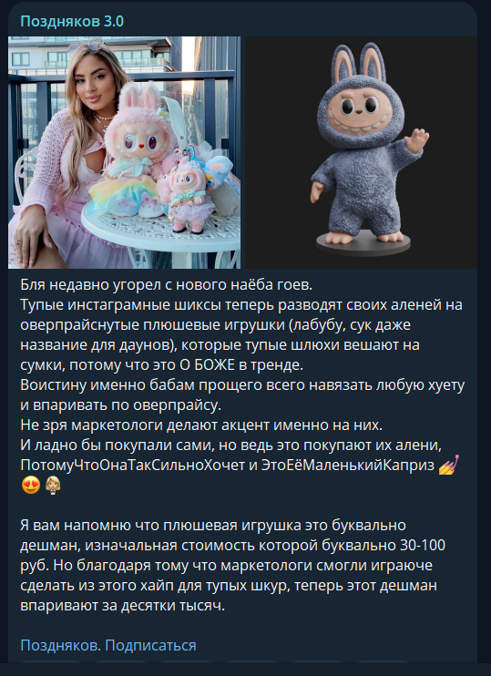 >>6172090 Кстати, «проблема» из этих лабуб раздута так же, как из квадроберов, которых 99,999% людей даже на улицах не видели, но уже из этого явления раздули проблему мирового масштаба и запрещали их повсюду и везде. Я у себя в городе вообще никого абсолютно не видела с лабубами, пусть даже подделками, хотя миллионник, модниц тоже полно. Чекайте, скоро опять выступят с какой нибудь хуетой, что их надо срочна запрещать.