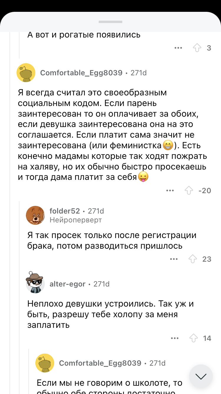 >>6174155 >Пункт про источник дохода тоже хороший Да, у нее должны быть свои деньги, НО БЕЗ 50/50 ОПЛАТЫ С КУНОМ. Он платит за ВСЕ. Она свои только на себя и откладывает СЕБЕ.