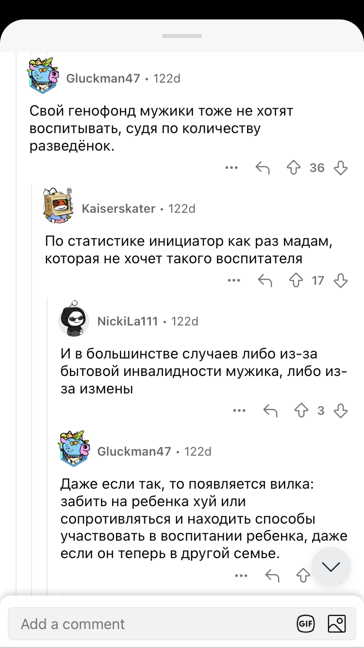 Просто то же самое насилие над женщинами регистрируется иностранными путешественниками по России и автобиографиями всех мастей и даже философской/художественной литературой (анализ которой с помощью ИИ настолько легким стал, что даже скан документа самому искать не надо, все на блюдце принесут). Простор для исследований и составление разгромных текстов для мужчин огромный, но почему то до сих пор ссылаются на перестроечный хлам, где чаще всего методологии исследований и достоверность фактов не просто вызывает вопросы, а фонит как уран-236