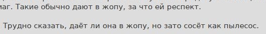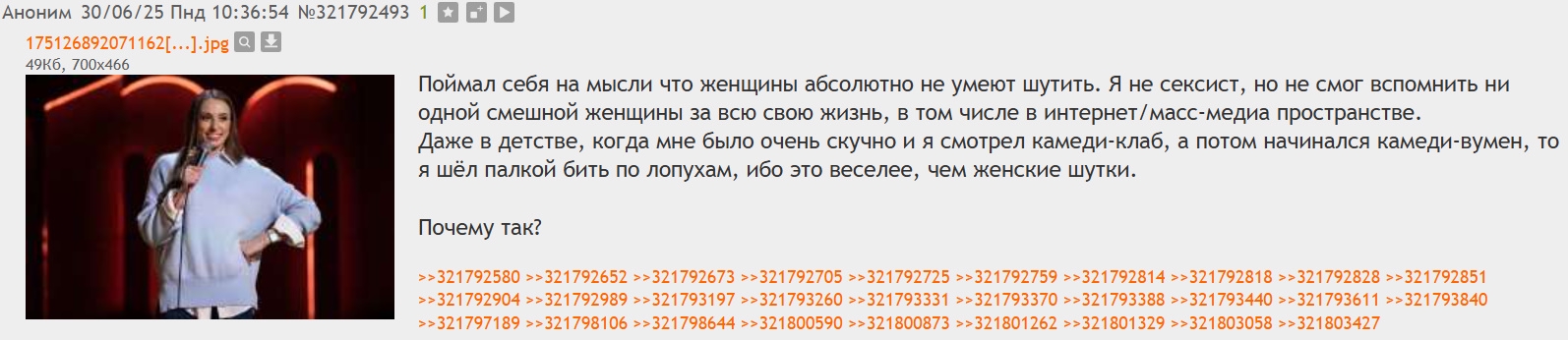 >>6183395 Когда нибудь тяначерская 37летняя девственница агрошиза узнает, что что секс это такая штука, где удовольствие взаимное, но не в этот день...не в этот... То, что многие женщины здесь секс воспринимают как зэки уголовники - это довольно печально. Вообще это довольно приятная штука с нравящимся тебе челом. Весь тред идиотский, кста. Вода мокрая, камни твердые, двач - известное прибежище всех женоненавистников, оказывается, мизогинен, вау! Прям Америку открыла, не меньше. Не вижу особого смысла накидывать говно на вентилятор, но, видимо, в тяначе так принято.