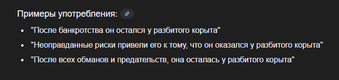 Не совсем высер чуханов, но если погуглить "что значит у разбитого корыта" то в пример гугл нейронка приводит такое: мушчина остается у разбитого корыта потому что его бизнес обанкротился и из-за рисков, а тян потому что шл8ха предальница!!