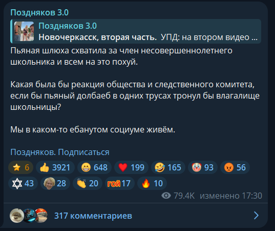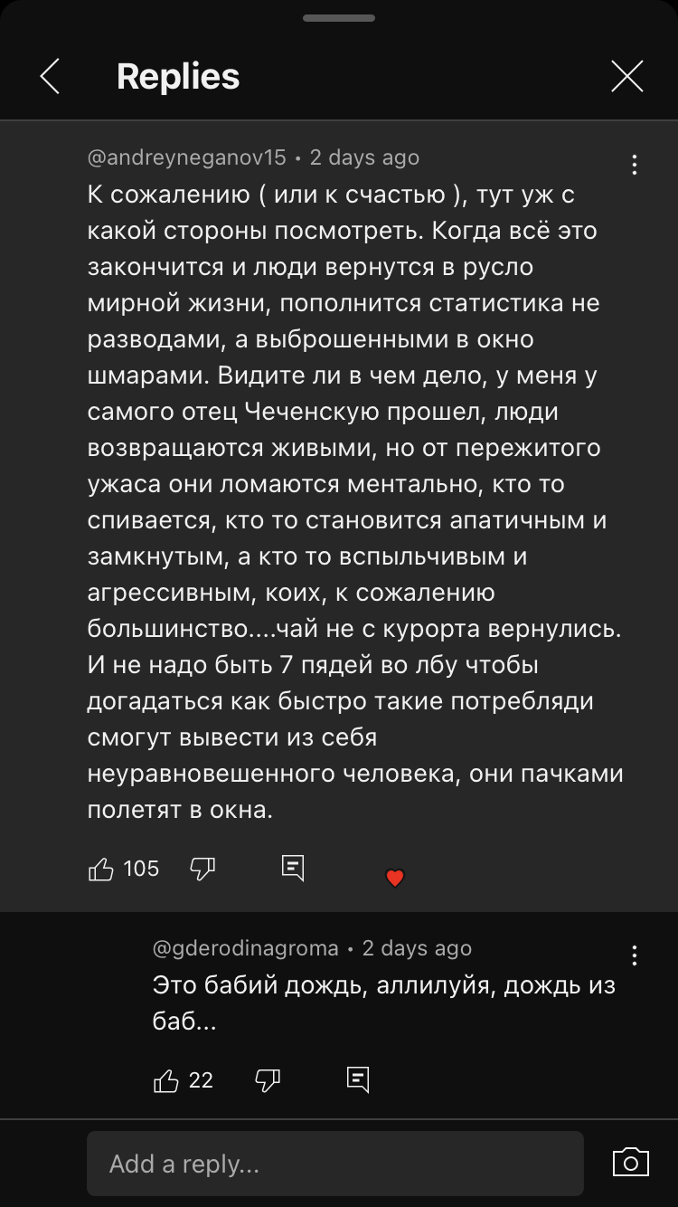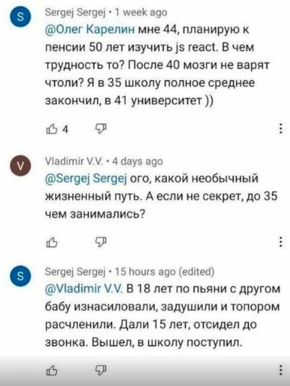 >>6166114 >большая часть высеров - пиздеж Там почти лям подписчиков. И это не юмористический канал. Т.е. там пишут как реально думают без иронии и сарказмов.