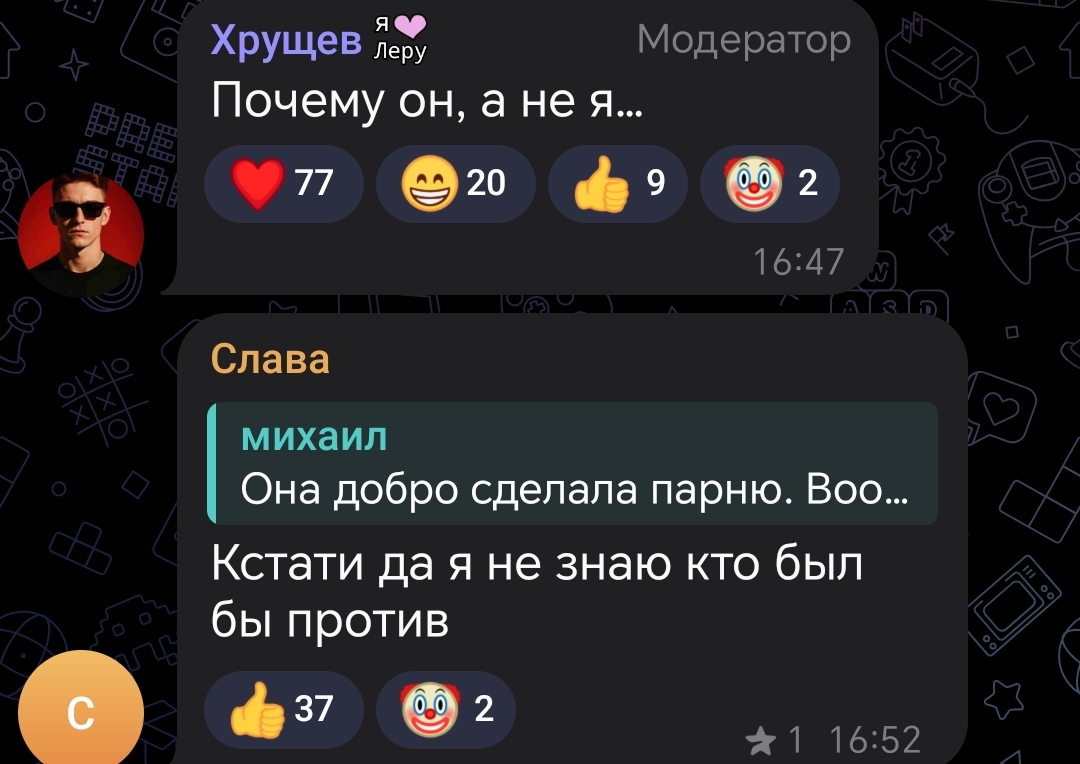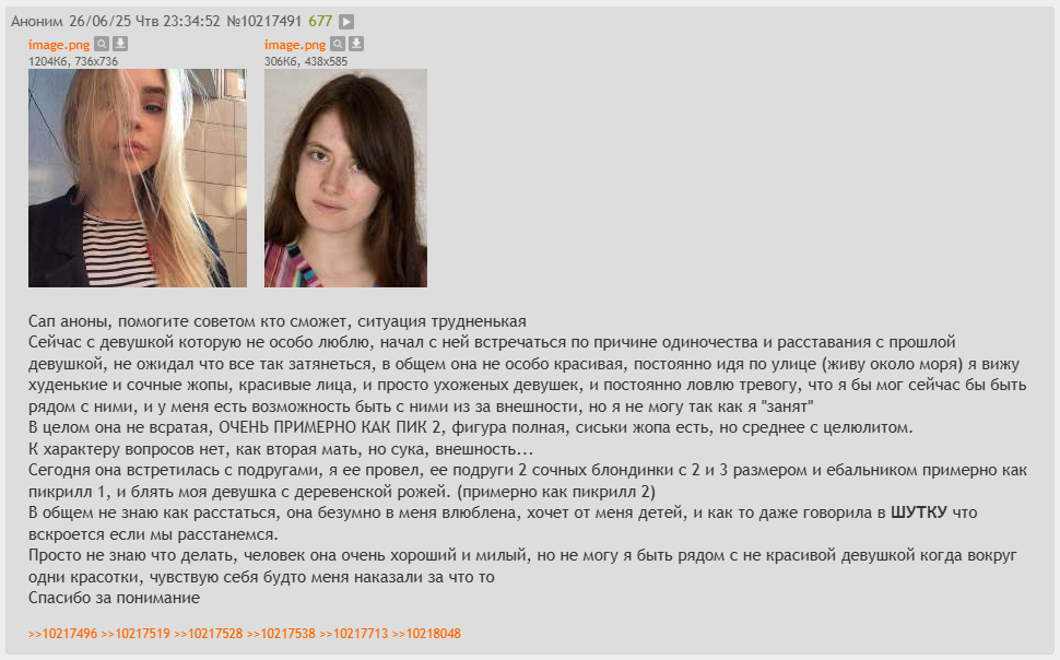 >>6180480 Я понимаю ,что меня сейчас закидают помидорами, НО СПРАВЕДЛИВОСТИ РАДИ, чел сразу обозначил, что изначально большой симпатии к ней не испытывал и начал встречаться просто от нехрен делать. И вроде как изменять тоже не хочет, обманывать, хочет честно расстаться, не желая оставить этим сильную травму деве. Ну то есть, блин, ну вот бывает так. Ну вот не привлекает его она, ну, случается, надо в совке что ли, ненавидя друг друга, живя как родственники, но зато вместе? Я не чухан, ес чо. Просто была в похожей ситуации на месте этого куна.