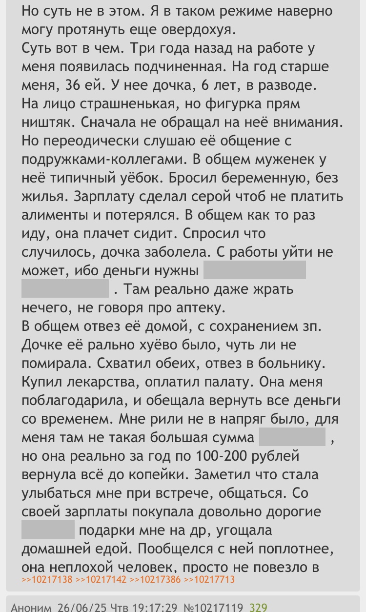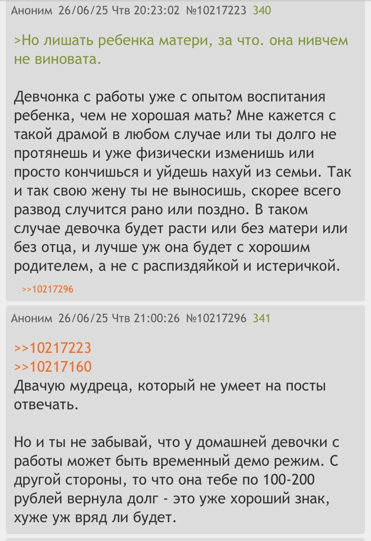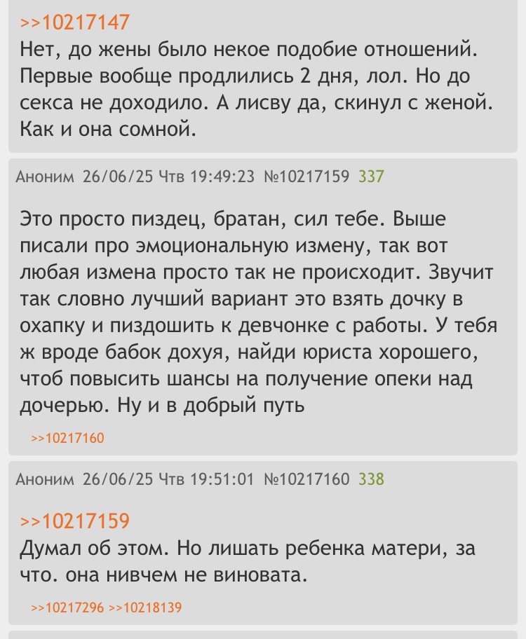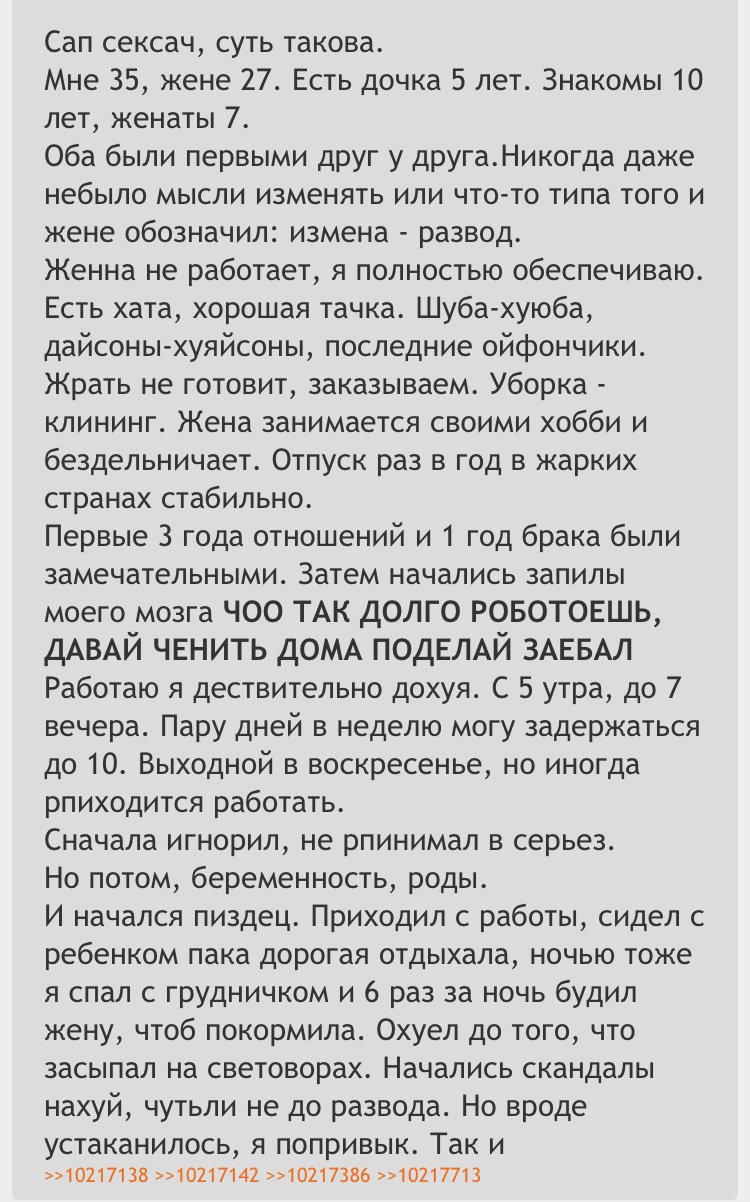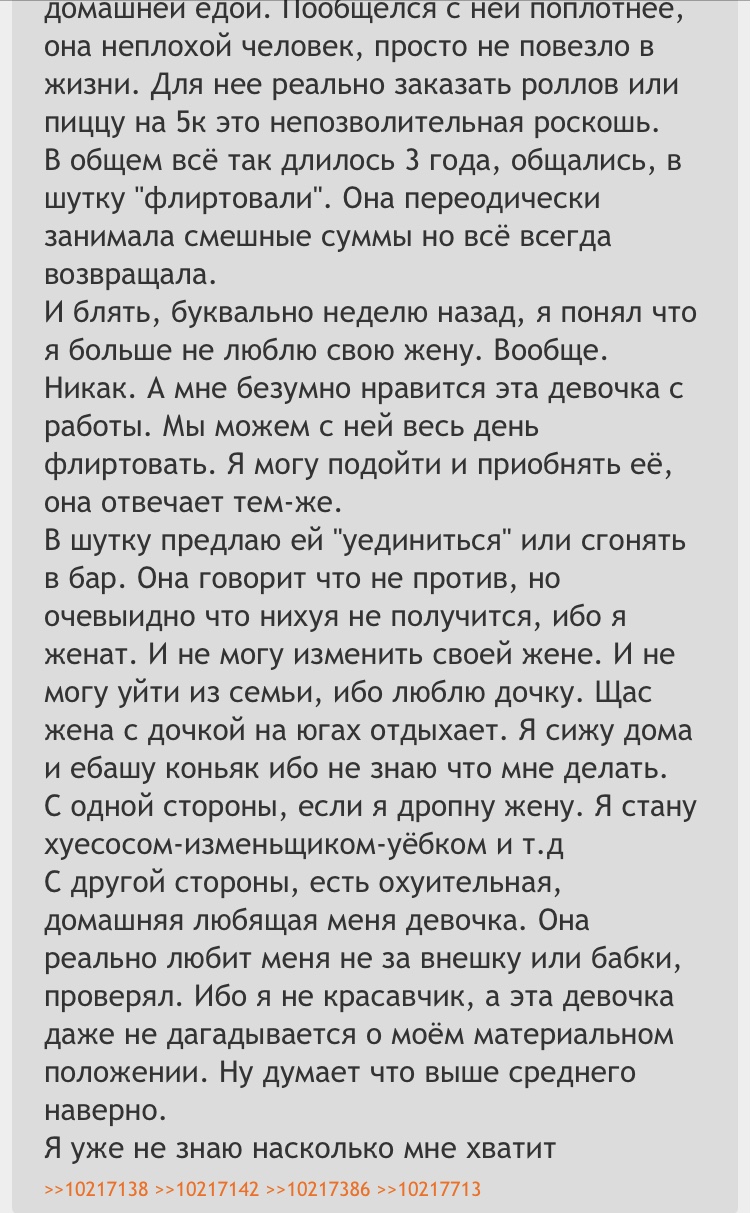>>6185034 Норм мужик с вроде благородными принципами и совестью, если все написанное правда то развод вполне оправдан >>6185052 >нахуй ему дочь Пишет же, что любит. Но главное что если дочь оставить с матерью, то у матери нет денег