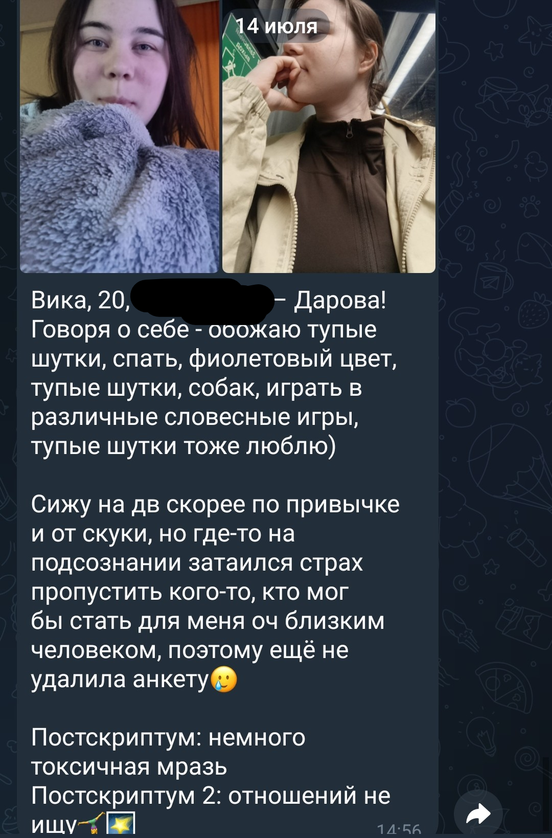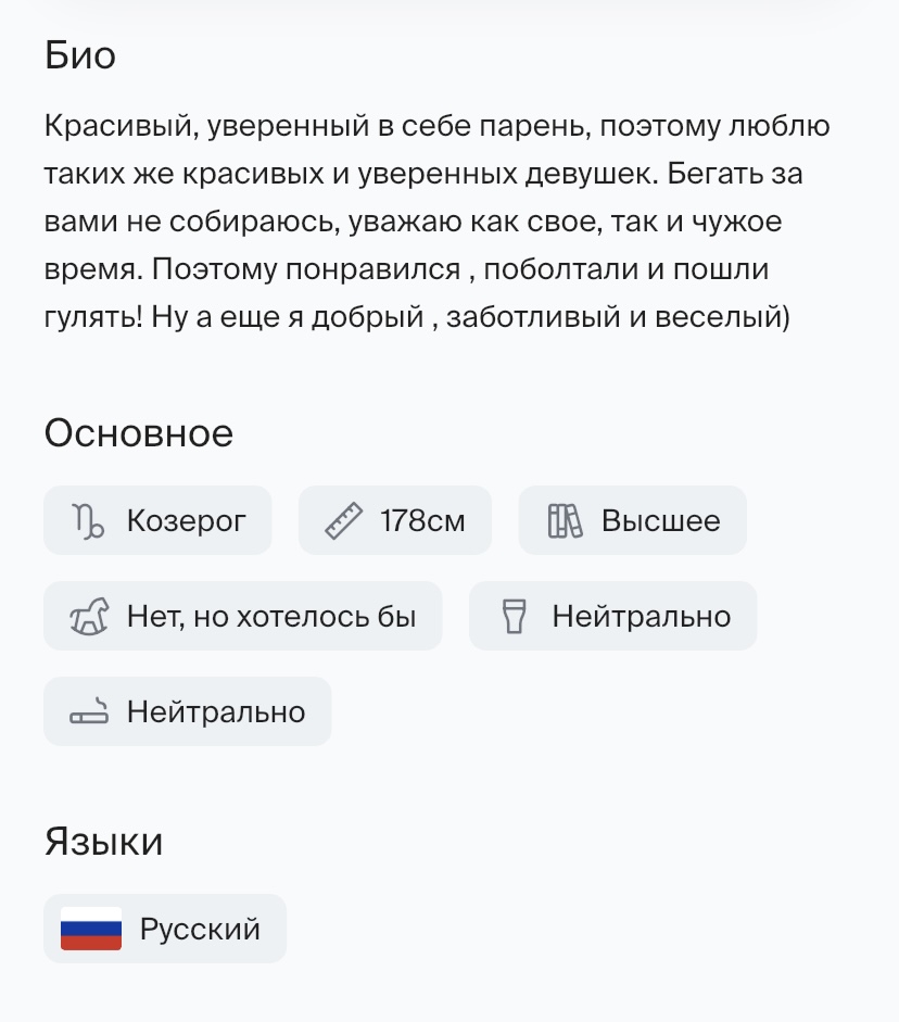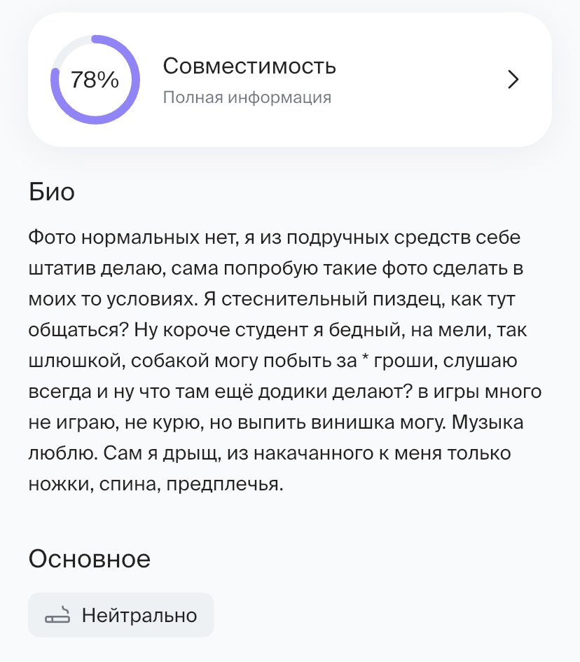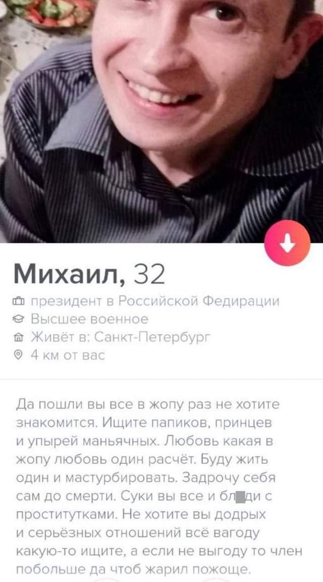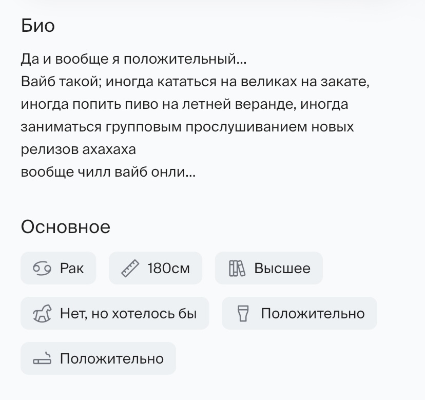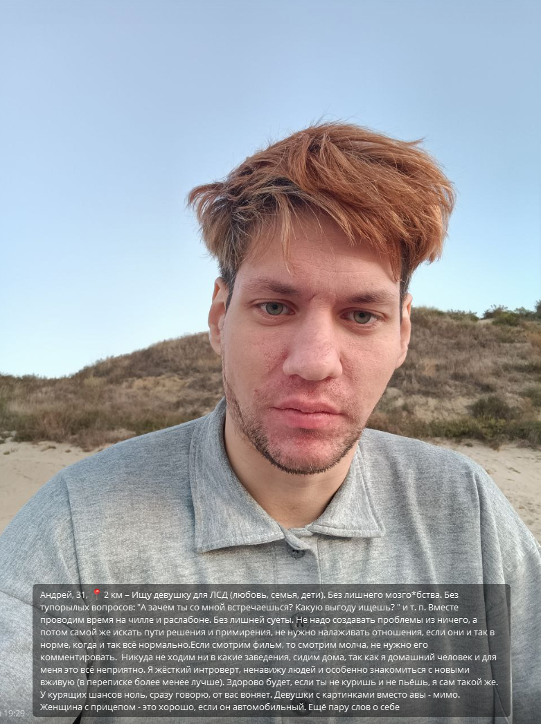 Просто пиздец АХХАХАХХА "я сильно разочарован в людях" поздравляю, мне похуй "мне не хватает поддержки" иди к ПЛАТНОМУ психологу или всё-таки хочется найти бесплатную девушку, которая будет эмоционально обслуживать?????? "меня примИт таким какой я есть" а мамы уже не хватает да, это чисто вот хочу маму вторую Свидание моей мечты ПРОГУЛКА насколько лохом (или нищим) надо быть чтобы ЭТО было мечтой Чел очевидно карлан какой "рост вес ОБСУДИМ ЛИЧНО"