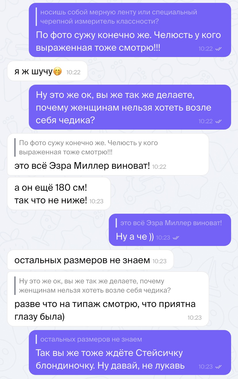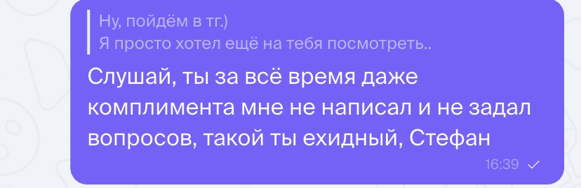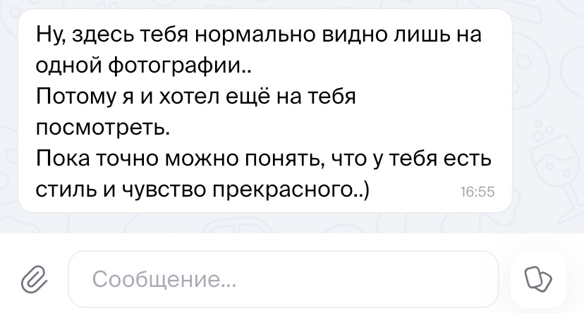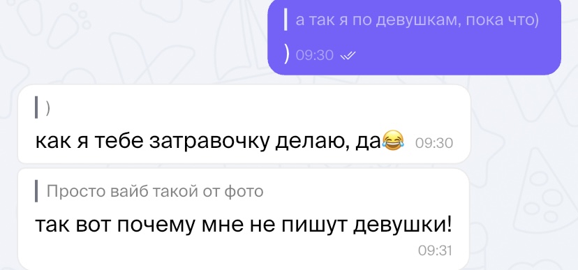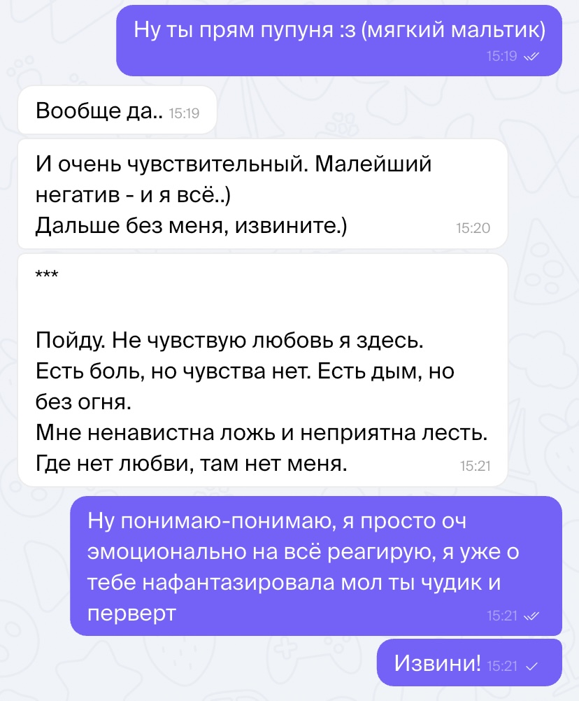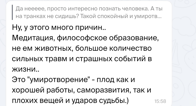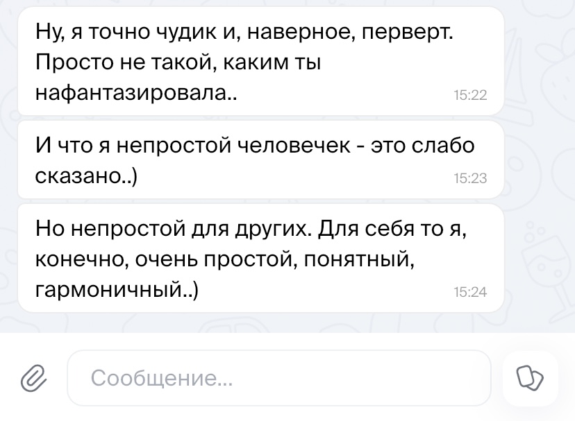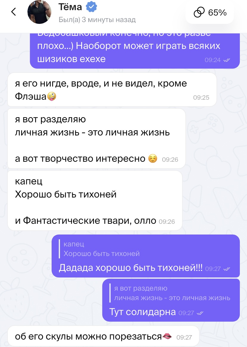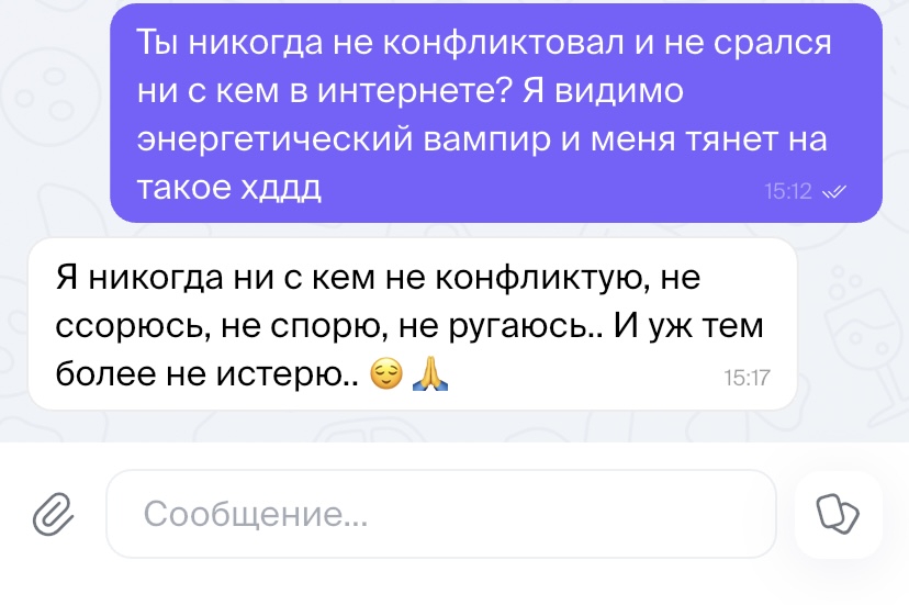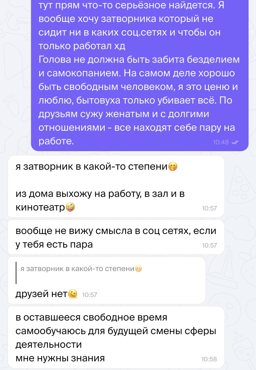 Меня этот кунчик как то лайкнул на дайговне, я ему написала привет, он ответил привет. Потом я зашла в его тгк, а у него там огромная слциоблядская жизнь, бомбы какие- то. И я поняла что просто не вывезла бы такое, я вообще ноулайферша. Поэтому диалога дальше не было….
