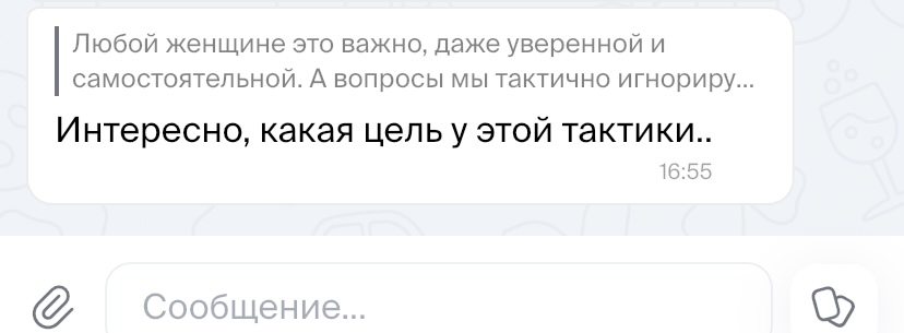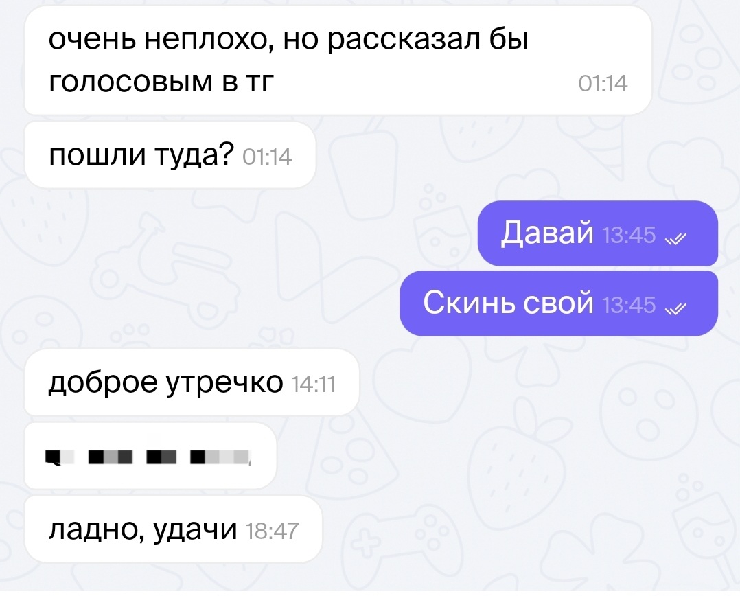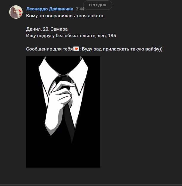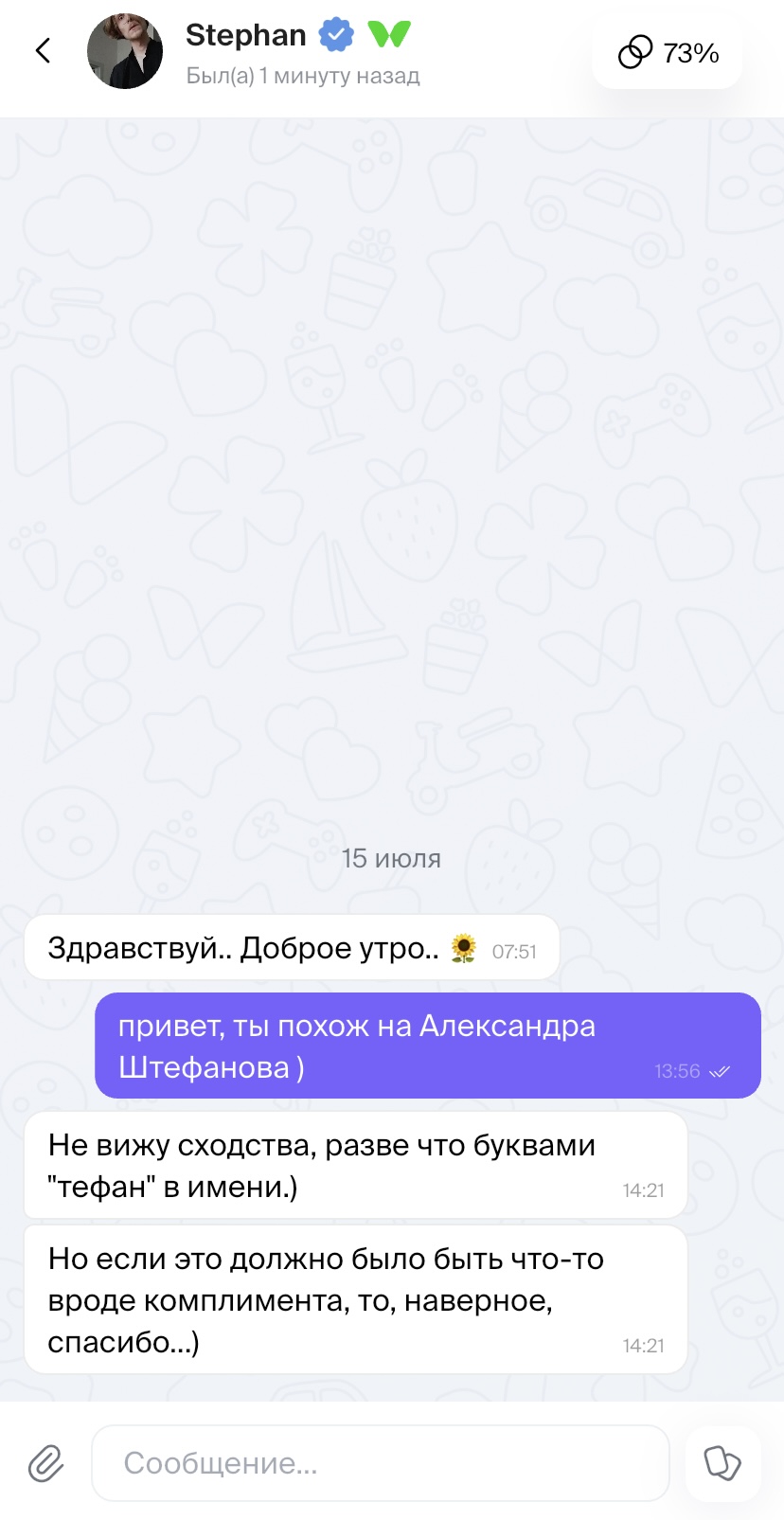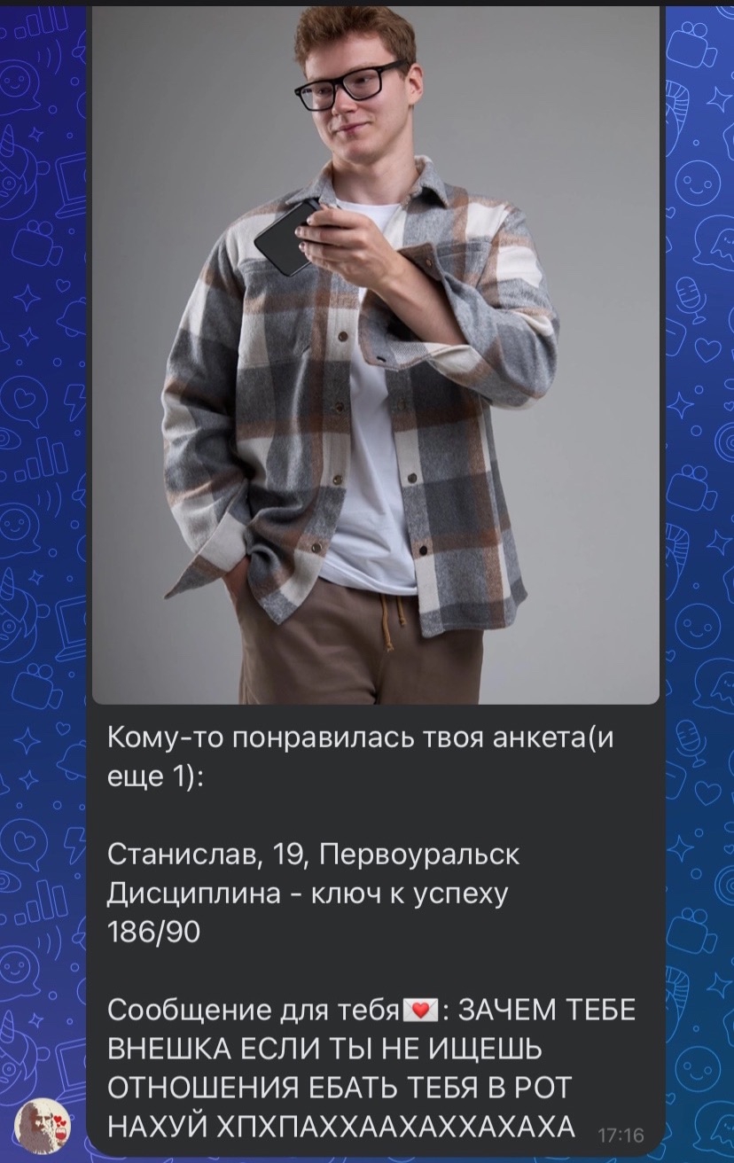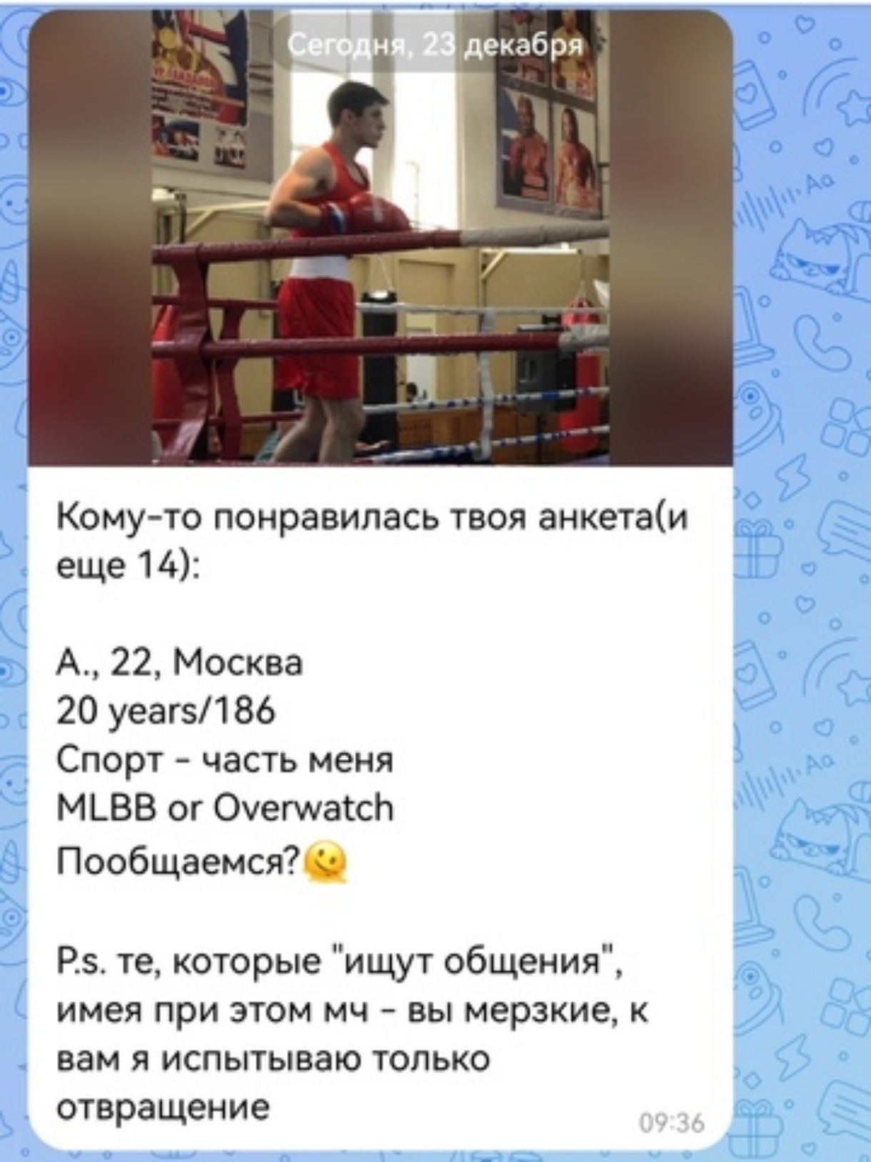 Меня этот кунчик как то лайкнул на дайговне, я ему написала привет, он ответил привет. Потом я зашла в его тгк, а у него там огромная слциоблядская жизнь, бомбы какие- то. И я поняла что просто не вывезла бы такое, я вообще ноулайферша. Поэтому диалога дальше не было….