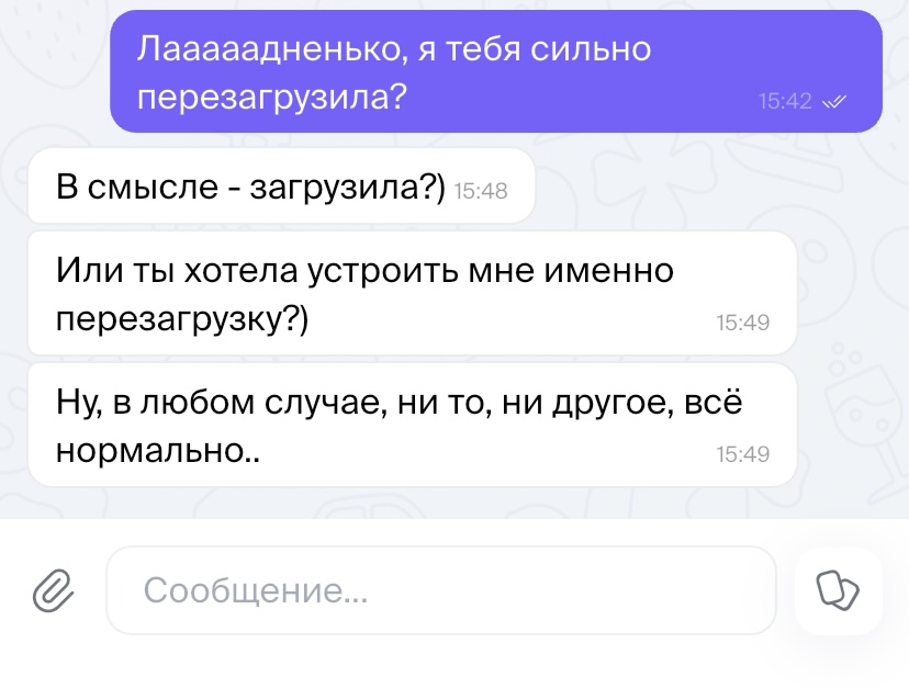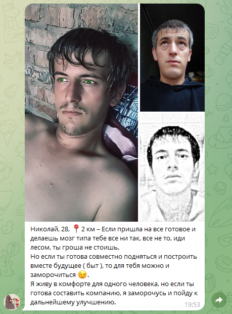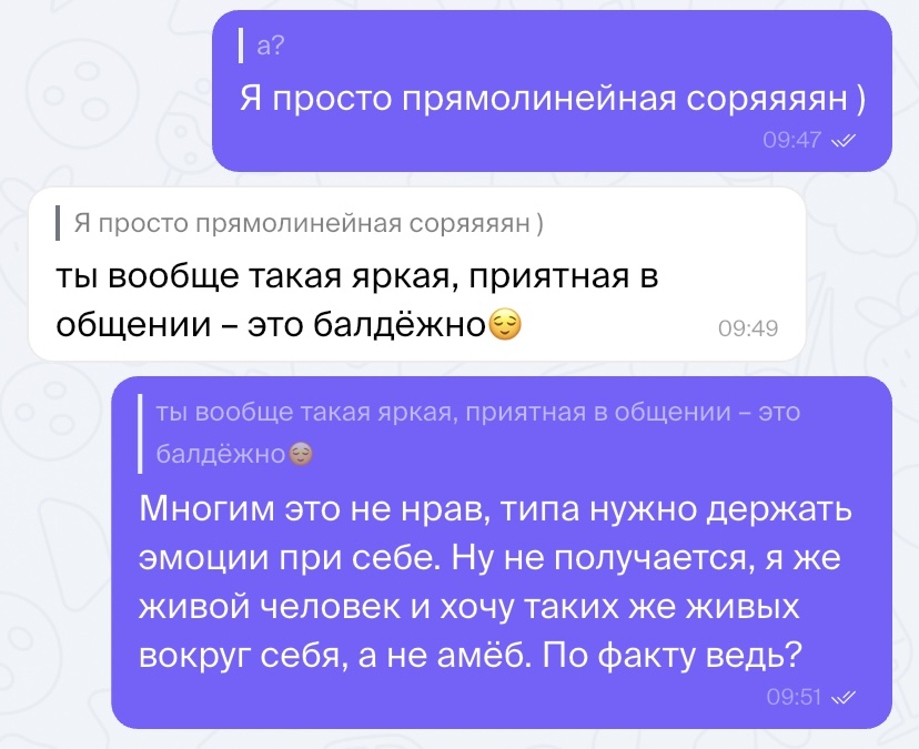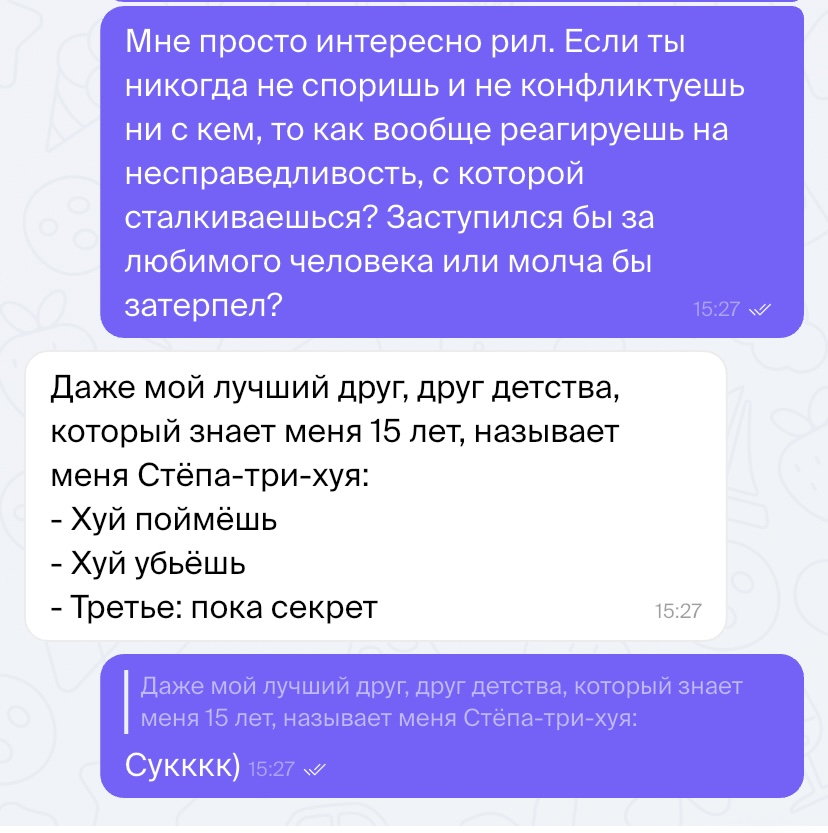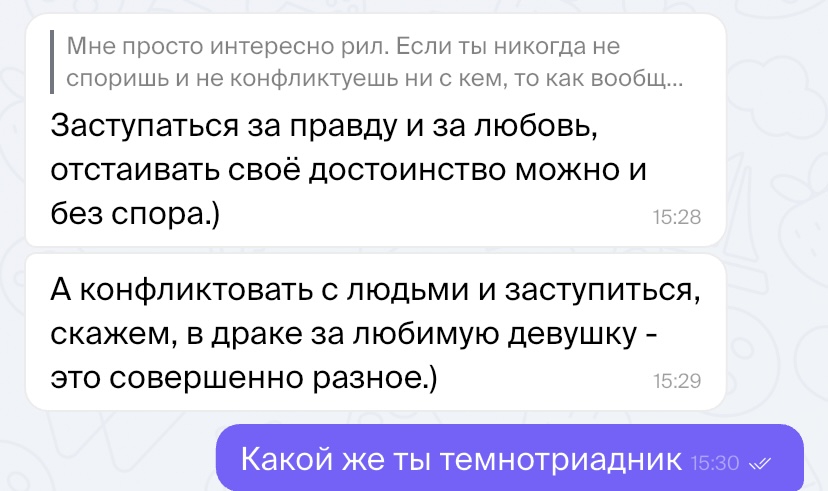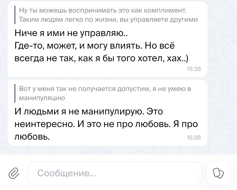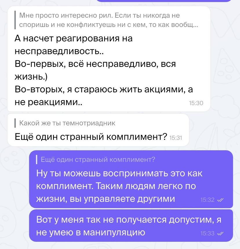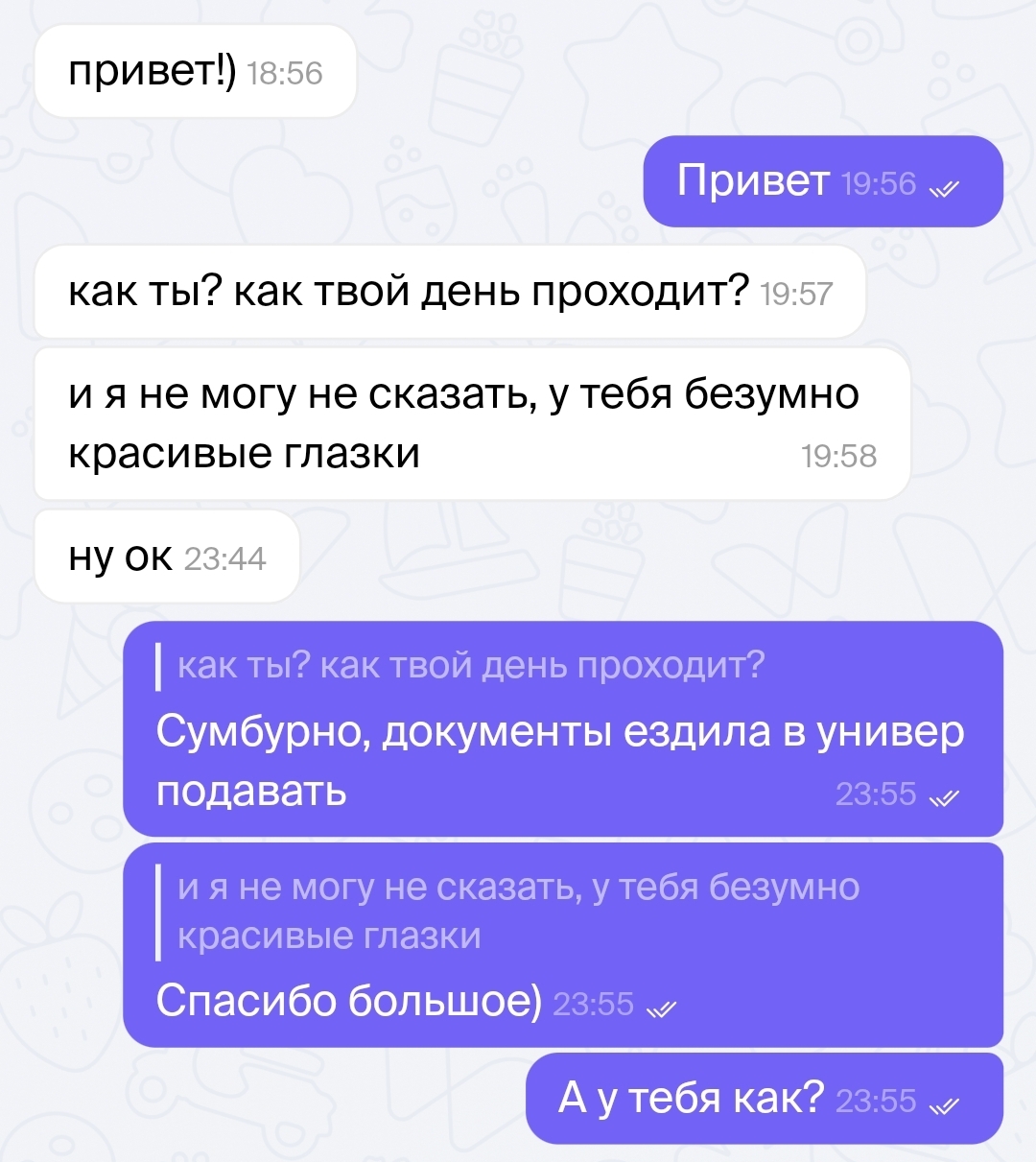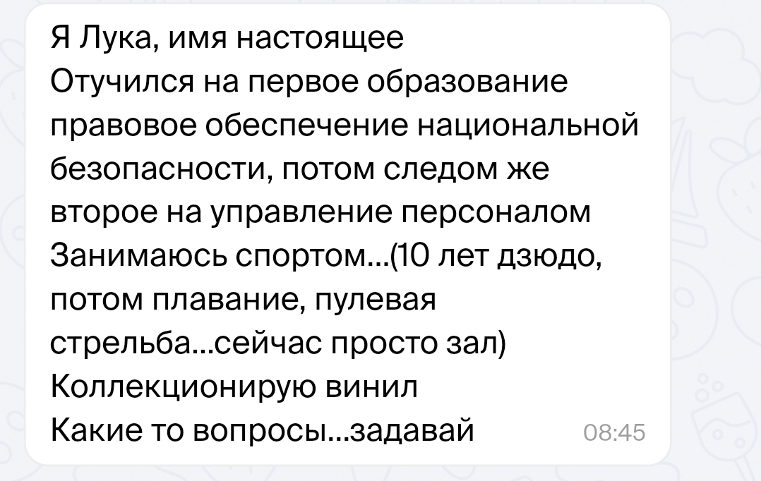 Меня этот кунчик как то лайкнул на дайговне, я ему написала привет, он ответил привет. Потом я зашла в его тгк, а у него там огромная слциоблядская жизнь, бомбы какие- то. И я поняла что просто не вывезла бы такое, я вообще ноулайферша. Поэтому диалога дальше не было….