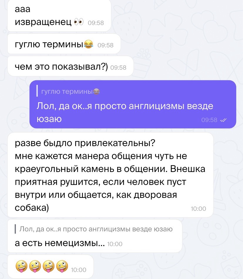Специально при знакомстве уже чуть ли не после привета начинаю сыпать всяким ненормисным говном и отсылками на всякую платину с двачей и нижние инторнеты, чтоб быдло отсеялось. Сеймы? Пока что дольше чем на полчаса хватило только джвух человек.