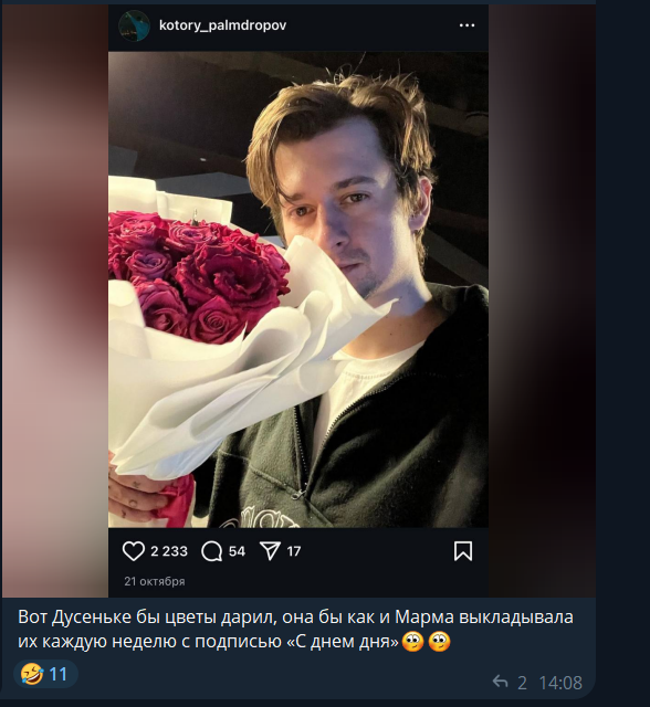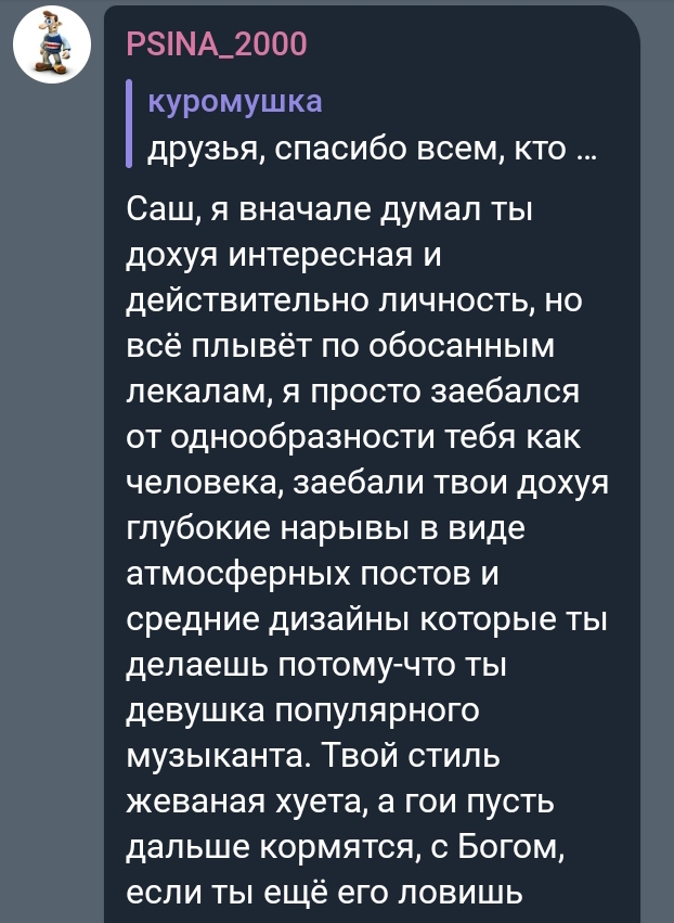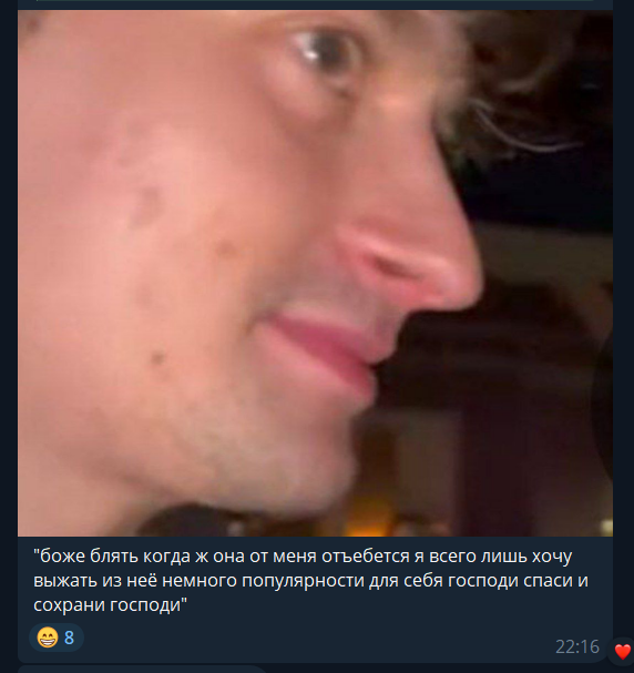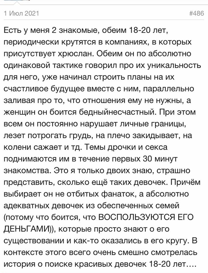 Наткнулась случайно на старый скрин с багини про Хряка. В общем и целом по многим тейкам это действительно на него похоже, особенно про "мне не нужны отношения" (он буквально так даже в треках поет), про скользкие темы и шутки, про девочек из обеспеченных семей (вспомните рпт-тян) Еще и забавно, что этот пост датируется летом 2021, когда Хряк с Орзушкой начали мутить))
