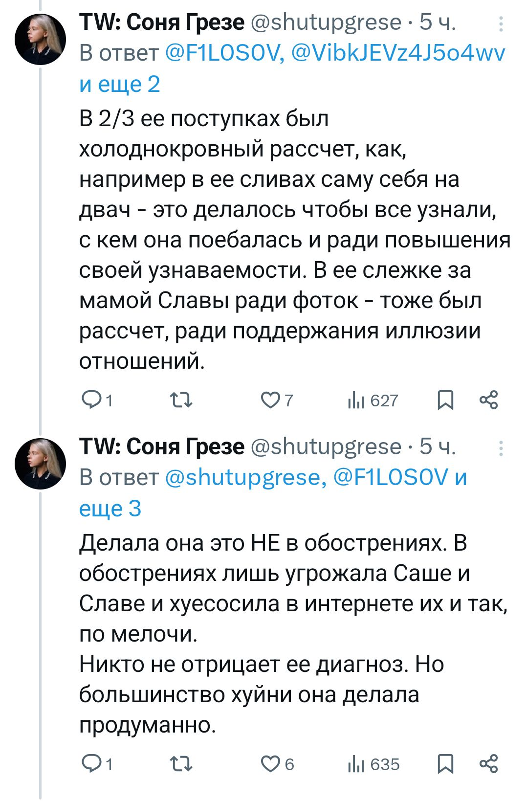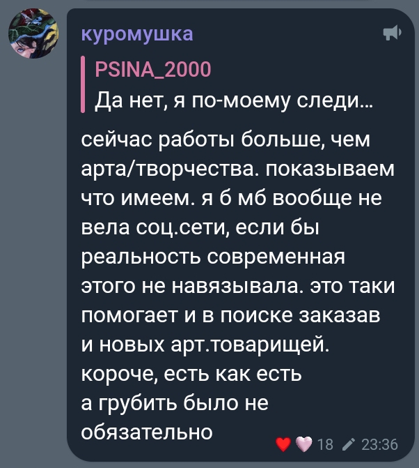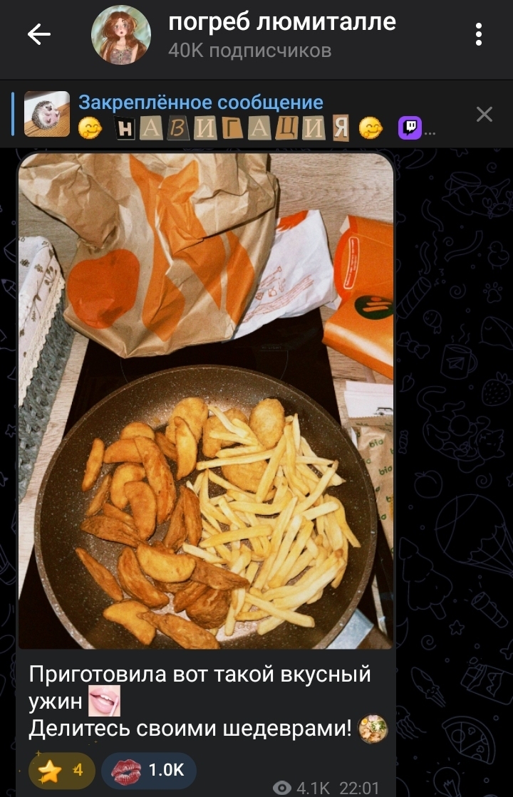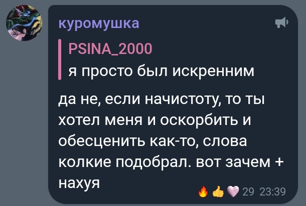 Картошен одно время вообще как влюбленный в нее себя вел, то комплименты, то жестко гасил. а как узнал, что у нее с Никитой, с которым они знакомы, отношения так вообще на нее начал гадости лить (не привязывая к тому, что она нашла парня, конечно, под другими предлогами). явно он в глубине души верил в этот шип. возможно если бы она ему проявила знаков внимания побольше и была чуть менее яркой личностью в медийке (такой как Шлюма), то Творец бы с ней очень даже отношался. а так слишком уж она деятельная и медийная. на таких он только в фанатзиях дрочит, а в жизни боится и прикрывает агрессивными рофлами, почти как и Мазелов