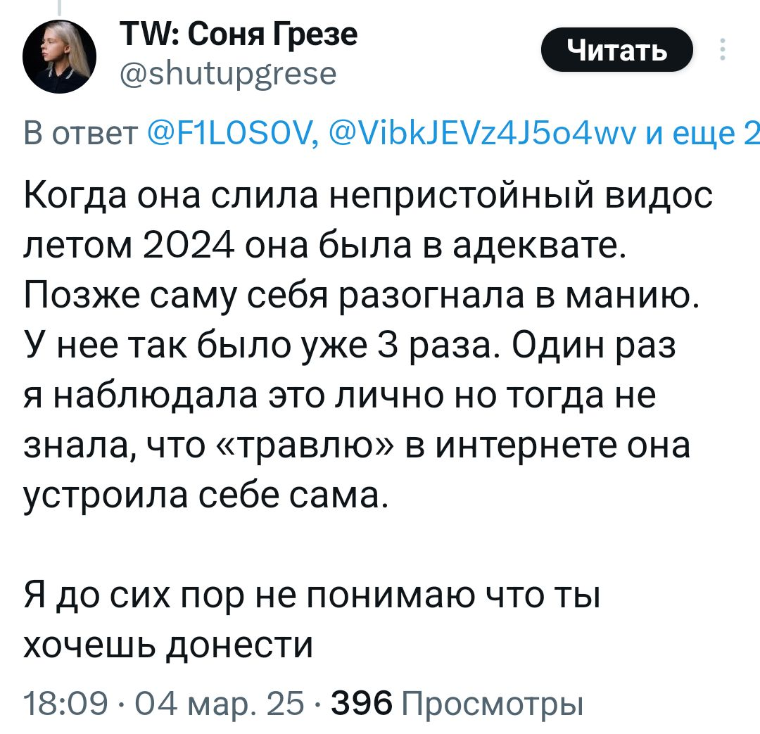 >>6224012 >>история каши многих научила Сомневаюсь. Они тупые и самоуверенные, каждый думает, что с ним не будет такого и каша сам объебался где-то, а вот "мы то умнее сразу ебанутую распознаем!!!" Кашу самого-то эта история не многому научила. Ебать Соллар которая мать родную продаст за любое упоминание своей персоны в медиа. При любых даже маленьких конфликтах бежала видео в тикток снимать и кружочки в тгк записывать. Меня удивляет, что она до сих пор шпане жопу лижет, а не наснимала "разоблачений" про то какие они все плохие К его новой тян я в тгк всего раз заходила. Там тоже были МеМаСы про ПрОбЛеМы с МеНтАлОчКоЙ и рассказы про какие-то таблетки. Короче, вряд-ли она адекватная, другая с ними и не свяжется
