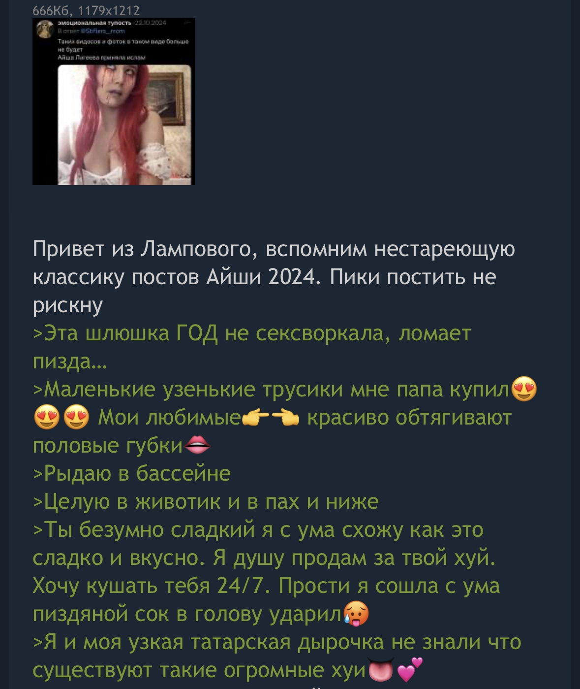 Спрошу еще тут. Сисы, а сюда или в муренач тред носили солевуху из тг, она еще кружочки пилила - то она из унитаза пьет, то с бомжами валяется, то танцует шизотанцы. В какой то теплой стране типа турции или таиланда, хз, такая еще, брюнетка с нарощенкой с вантузом вместо лица, худая, стремненькая, на Лию Стеффи похожа. Напомните, а? Где смотреть?