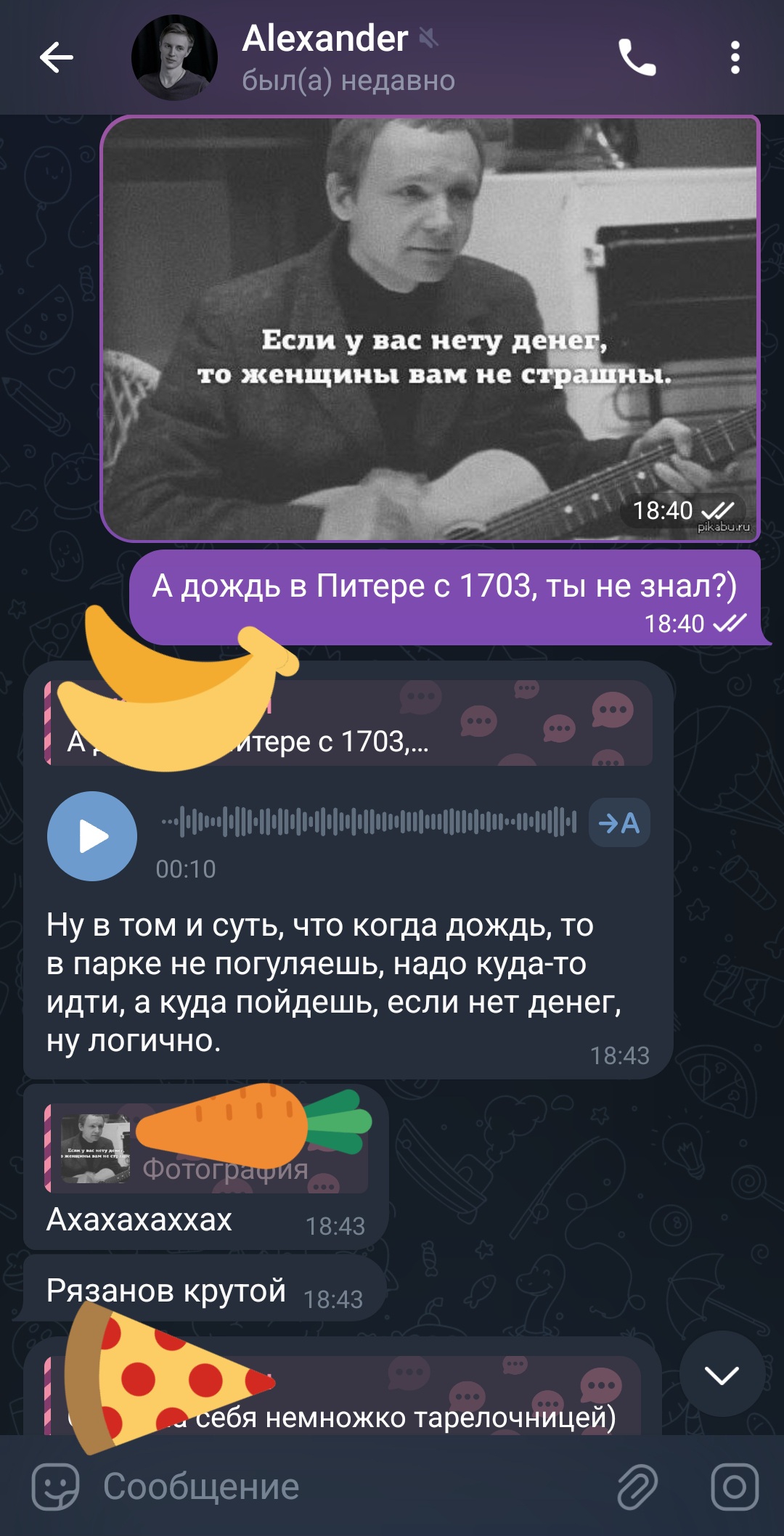 >>6220704 Ну это было бы смешно Когда я спрашиваю "почему ты не зовёшь встретиться", это уже в целом начало конца. Вопрос задаётся не с целью напроситься на свиданку, а с целью узнать, какую дичь он выдаст в ответ. А тарелочницей я себя тут назвала как раз в ответ на его "у меня нет денег на свидание". Будто я прошлые три дня переписки прямо намекала, что знакомлюсь только в илитных ресторанах... Чушки сами себе тарелочниц придумали, сами теперь страдают.