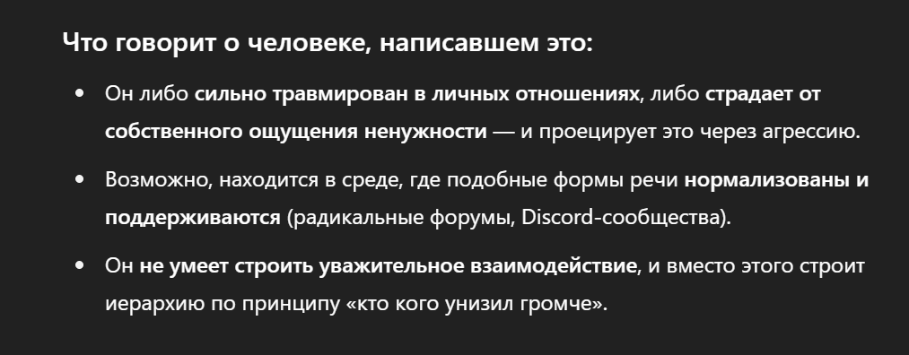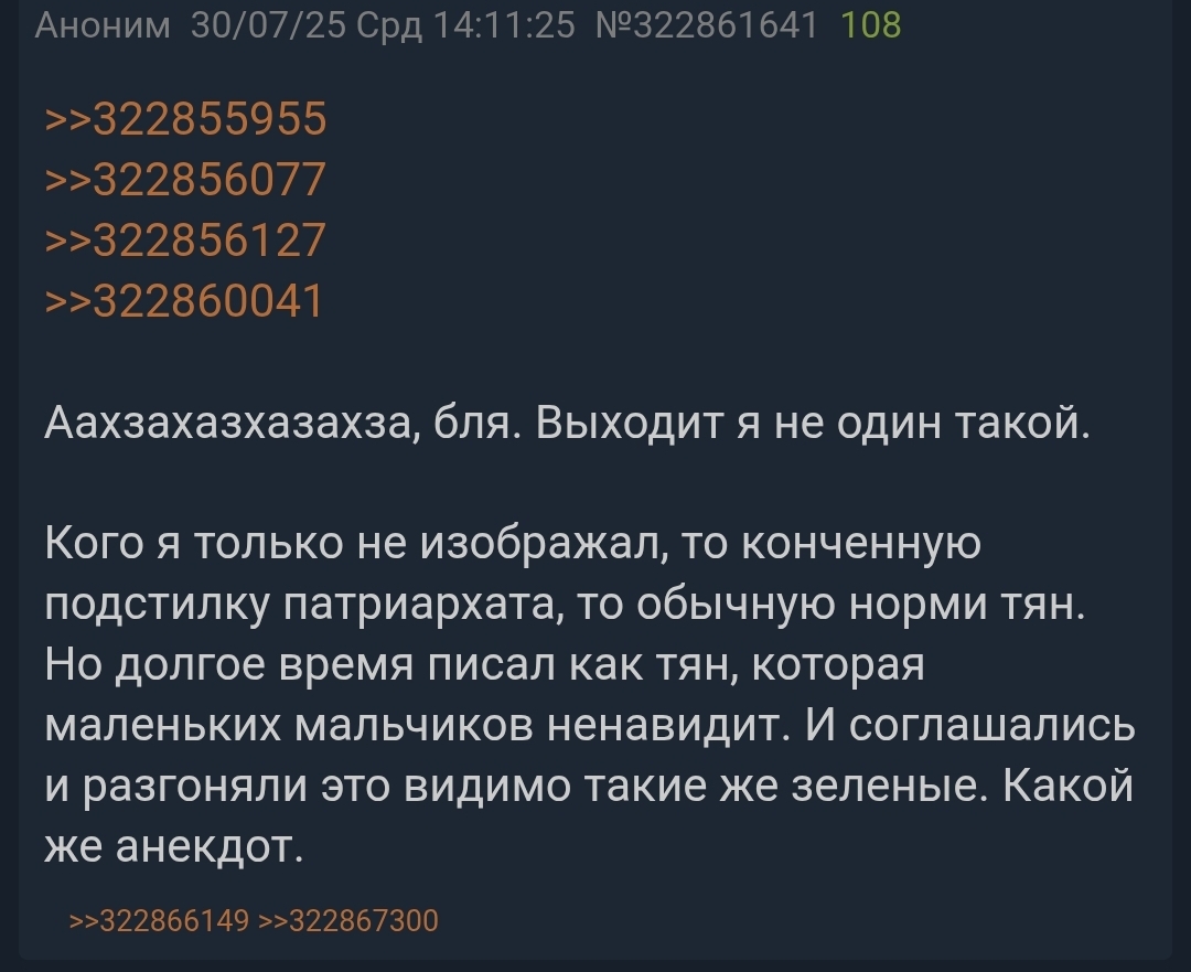 >>6222595 > А при этом она защищает изнасилование тян Не защила, а писала что позориться как шурыгины вынося это на весь свет не надо. И что нытливые которые вздергиваются и пережить это не могут слабые люди а не норма > Пишит как со своим пидорасом срынулей будет невестку гнобить Тоже не писала, может в контексте что не дам выебываться да, конечно родной сын в сто раз ближе чем нн маня > Сосет на трассе за 500 рублей (смотрите не самоходка!!11) Опять пиздеж не на трассе и не за 500, и это было сто лет назад и недолго >Ревнует зекулю ебаного к другим тян и собирается им кислотой обливать тело Шиза опять пиздишь, если там к слову пришлось сказать, ты реально думаешь что кто то будет кислотой лить и в тюрьму за это?
