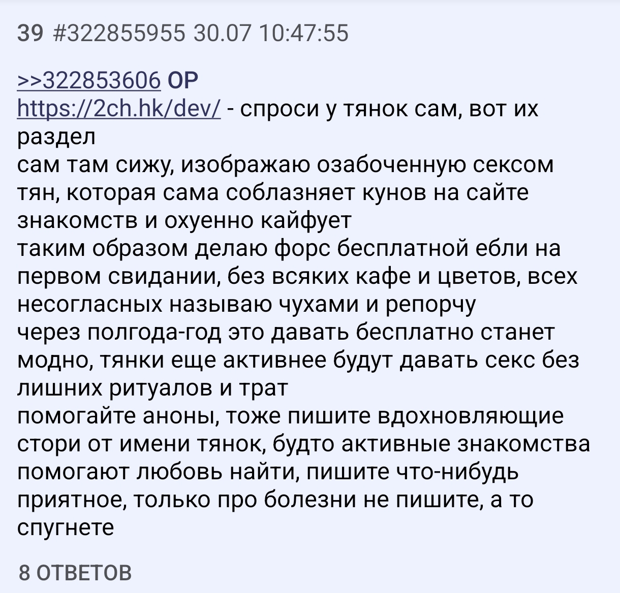Прям на днях видела коммент от возмущенной нормиски. Ее знакомый хвастается, что находит одиноких женщин с детьми, хуевой самооценкой, максимально втирается в доверие, играя роль идеального заботливого куна, а потом продавливает на свои извращенные практики в сексе под соусом любви. После чего конечно же дропает.
