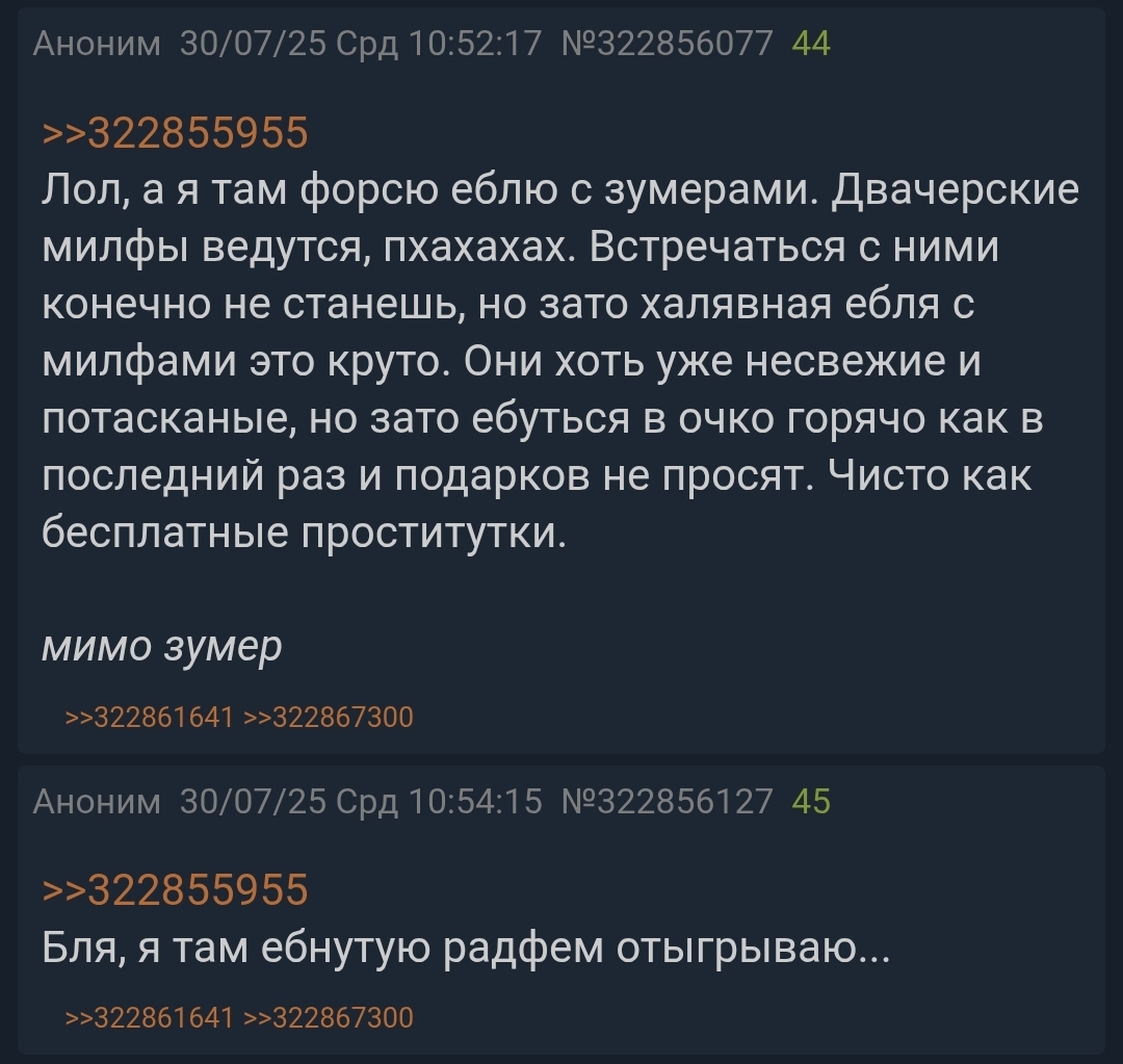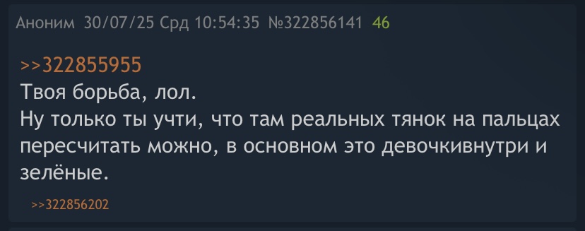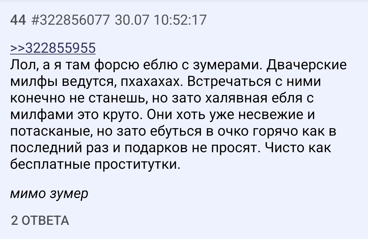 >>6222029 У тебя двач головного мозга, если ты всё пытаешься вывести какую-то среднюю температуру по больнице. Давай я буду ебаться с кем хочу и когда хочу, а ты...ну тоже с кем хочешь и когда хочешь. Только у нас это разные периоды с начала знакомства будут. И для каждой это будет её личный "разумный" параметр. Я за 5 свиданий уже стала сомневаться, что я человеку вообще нравлюсь, 0 тактильности в мою сторону. Ещё раз: мы даже за ручку не ходили это время, а ты уже про поцелуи. Но если тебе такой формат ок, то ты найдёшь себе подходящую пару, надо просто это обозначать сразу, неподходящие (ака ёбыри-на-первом-свидании) отвалятся быстро