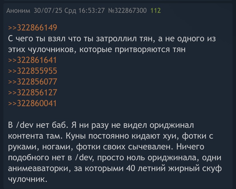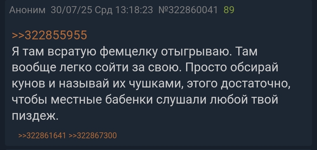 >Реальность же такова, что чушки это уебища и фашисты, просто одна из вас хочет с ними ебаться и ебется, ей нравится, она получает от этого удовольствие. А ты не получаешь - естественно, как получать удовольствие от такой хуйни, я тебя очень понимаю. Мне самой секс нахуй не упал, поэтому я и кнн.