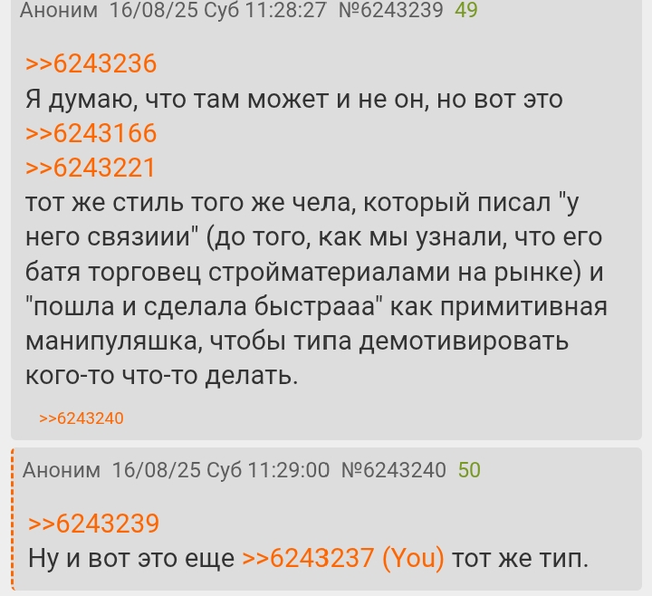 >>6243236 Я думаю, что там может и не он, но вот это >>6243166 >>6243221 тот же стиль того же чела, который писал "у него связиии" (до того, как мы узнали, что его батя торговец стройматериалами на рынке) и "пошла и сделала быстрааа" как примитивная манипуляшка, чтобы типа демотивировать кого-то что-то делать.